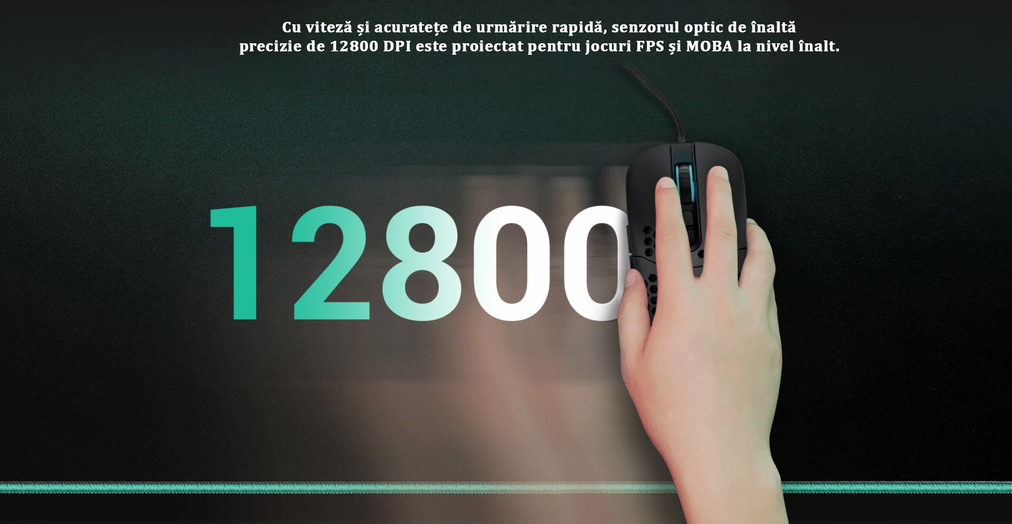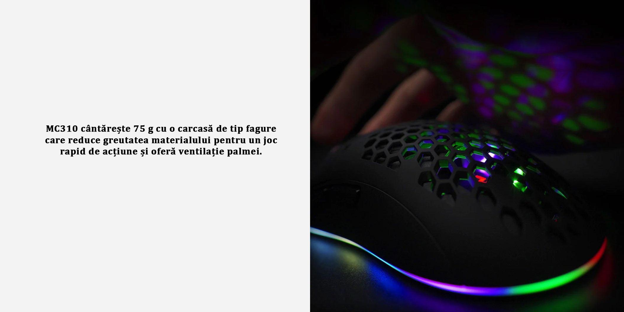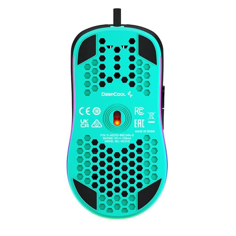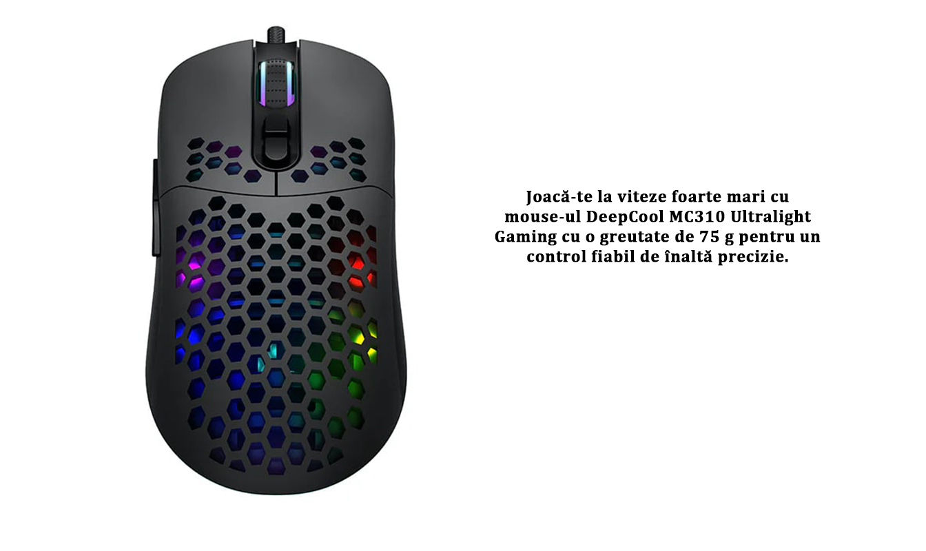 Mouse gaming Deepcool MC310 iluminare aRGB negru, carcasa perforata pentru o aerisire mai buna a mainii, iluminare aRGB, 12800 DPI, 200IPS, acceleratie 20G, polling rate: 1000/500/250/125Hz, senzor optic, micro switch-uri Huano (durata de viata: 10 milioane click-uri), numar butoane: 7 (7 programabile), 11 moduri de iluminare (16.8 milioane de culori disponibile), configurabil prin intermediul aplicatiei, picioruse de teflon, conector USB, cablu imbracat in material textil, lungime cablu: 1.8m, dimensiuni: 126x68x38mmmm, greutate: 88g, USB