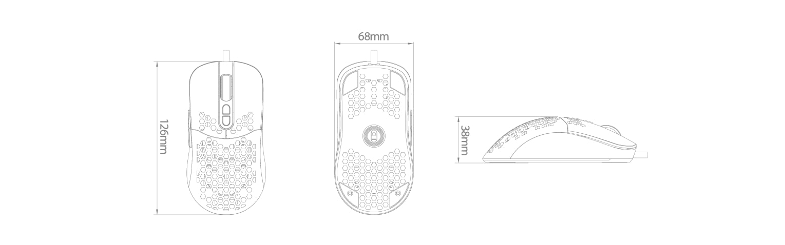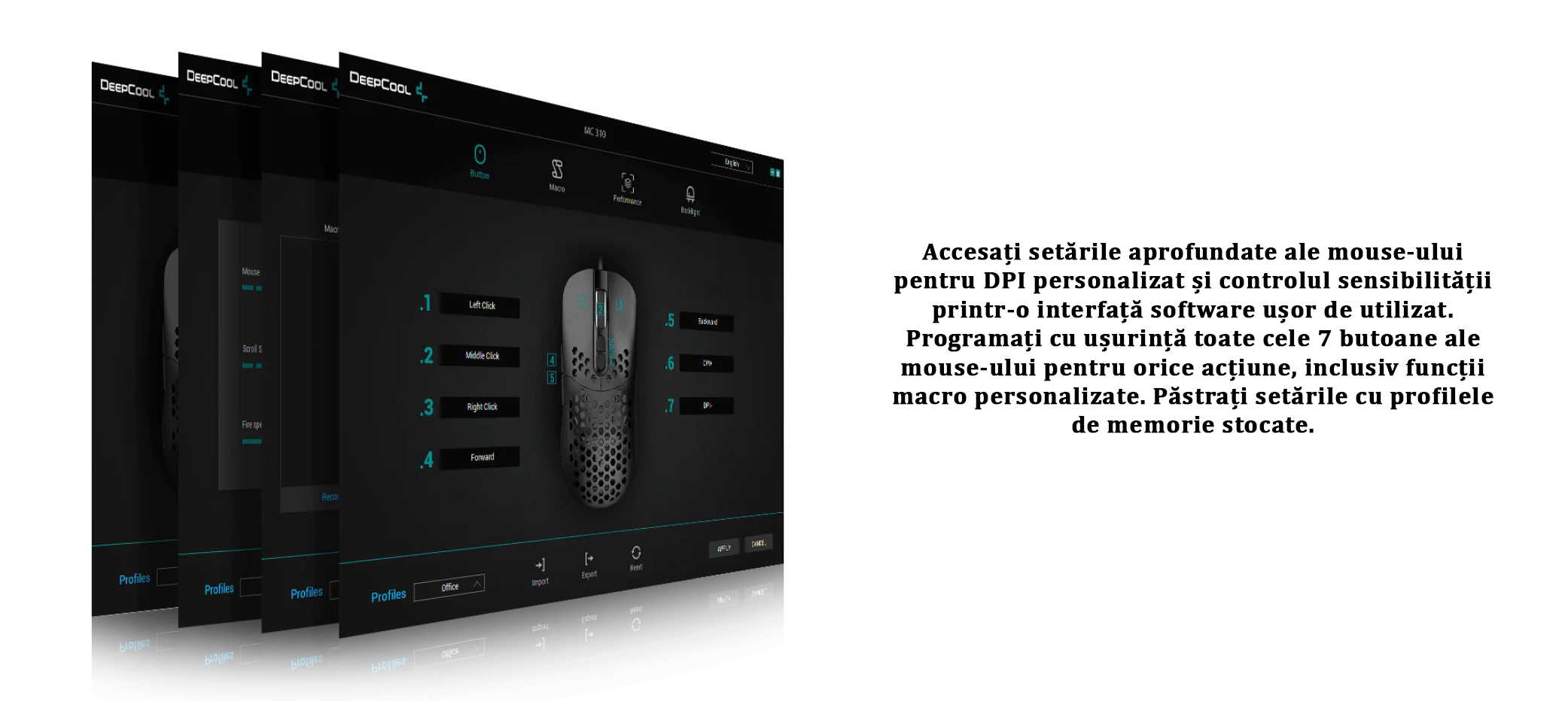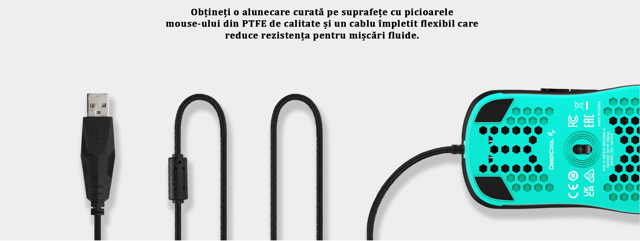 Mouse gaming Deepcool MC310 iluminare aRGB negru, carcasa perforata pentru o aerisire mai buna a mainii, iluminare aRGB, 12800 DPI, 200IPS, acceleratie 20G, polling rate: 1000/500/250/125Hz, senzor optic, micro switch-uri Huano (durata de viata: 10 milioane click-uri), numar butoane: 7 (7 programabile), 11 moduri de iluminare (16.8 milioane de culori disponibile), configurabil prin intermediul aplicatiei, picioruse de teflon, conector USB, cablu imbracat in material textil, lungime cablu: 1.8m, dimensiuni: 126x68x38mmmm, greutate: 88g, USB