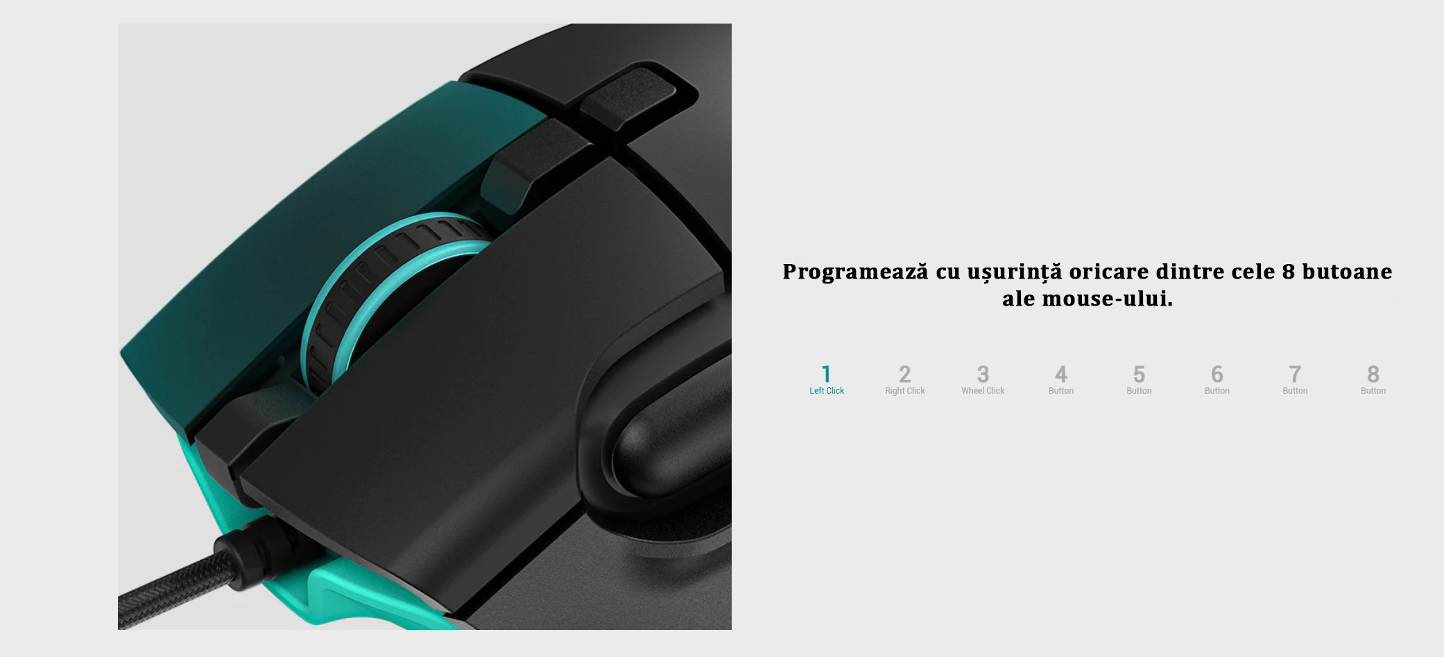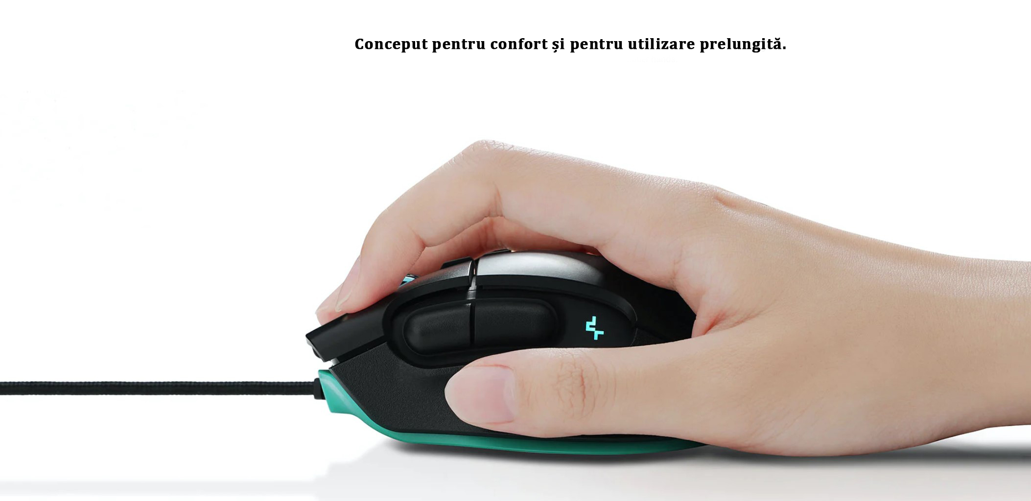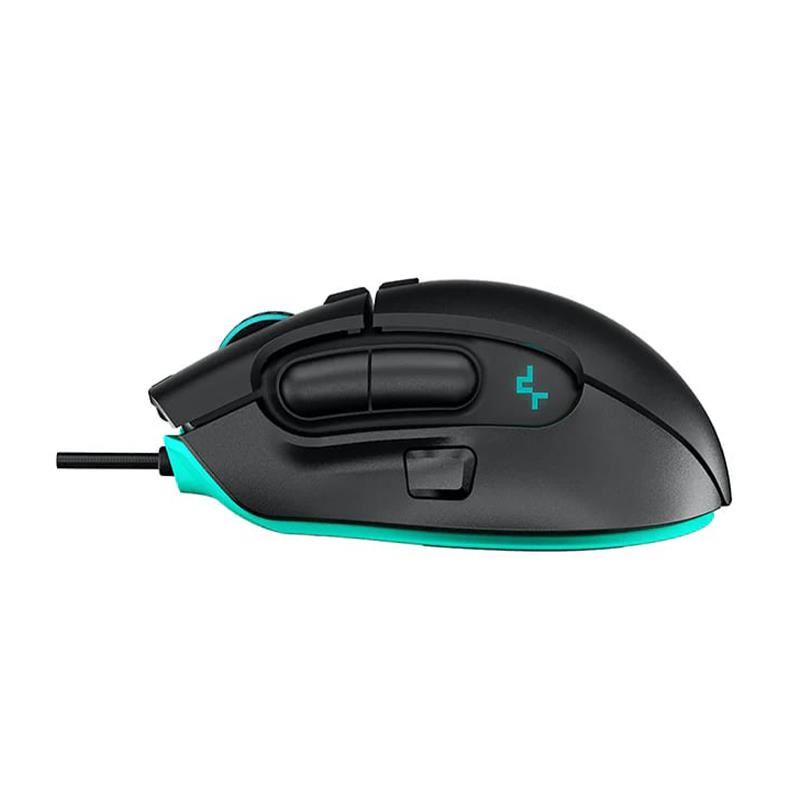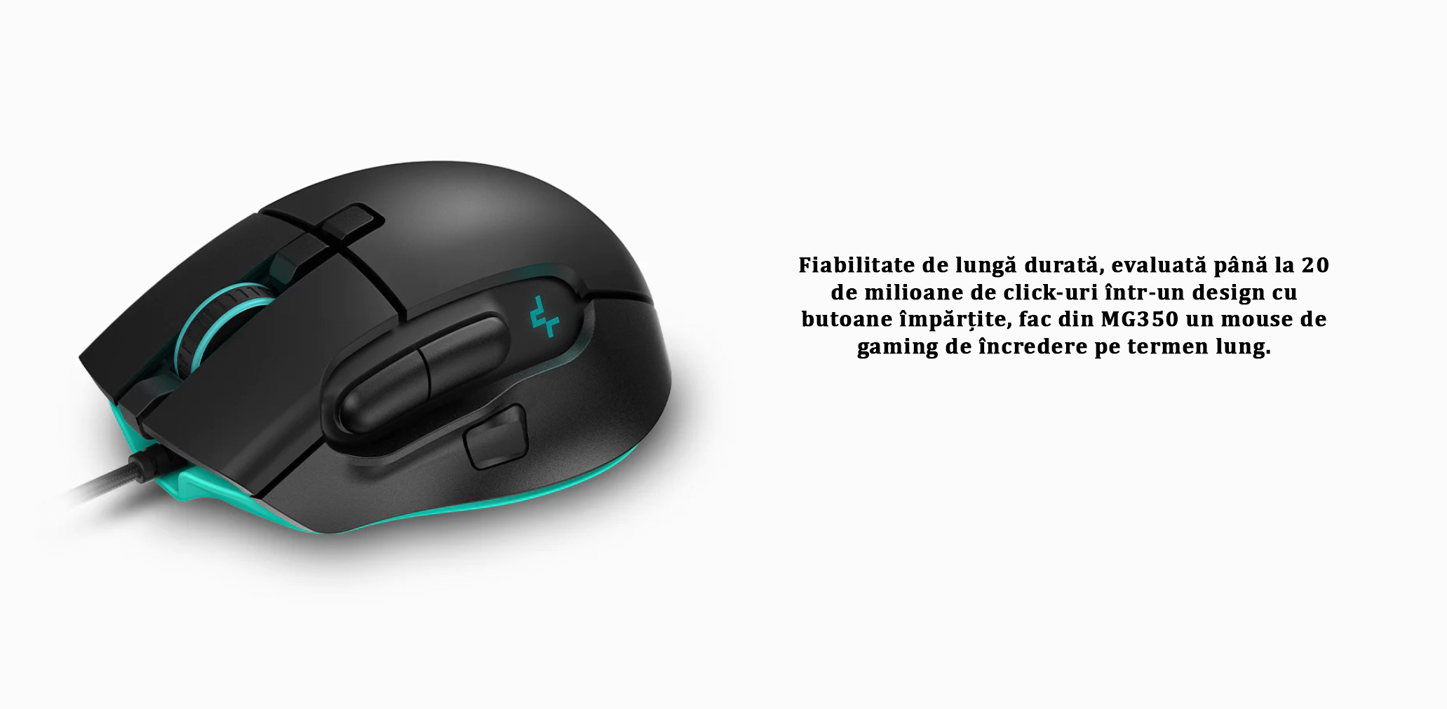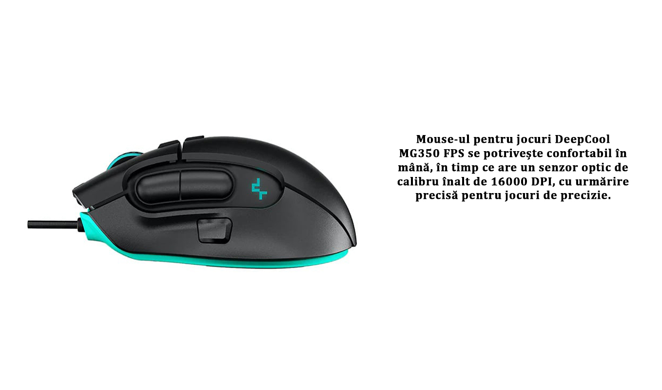 Mouse gaming Deepcool MG350 negru, iluminare verde, 16000 DPI, 400IPS, acceleratie 40G, polling rate: 1000/500/250/125Hz, senzor optic PAW3335DB-TZDU, micro switch-uri Omron (durata de viata: 20 milioane click-uri), numar butoane: 8 (8 programabile), 2 moduri de iluminare, configurabil prin intermediul aplicatiei, picioruse de teflon, conector USB, cablu imbracat in material textil, lungime cablu: 1.8m, dimensiuni: 107x73x44mmmm, greutate: 92g, USB