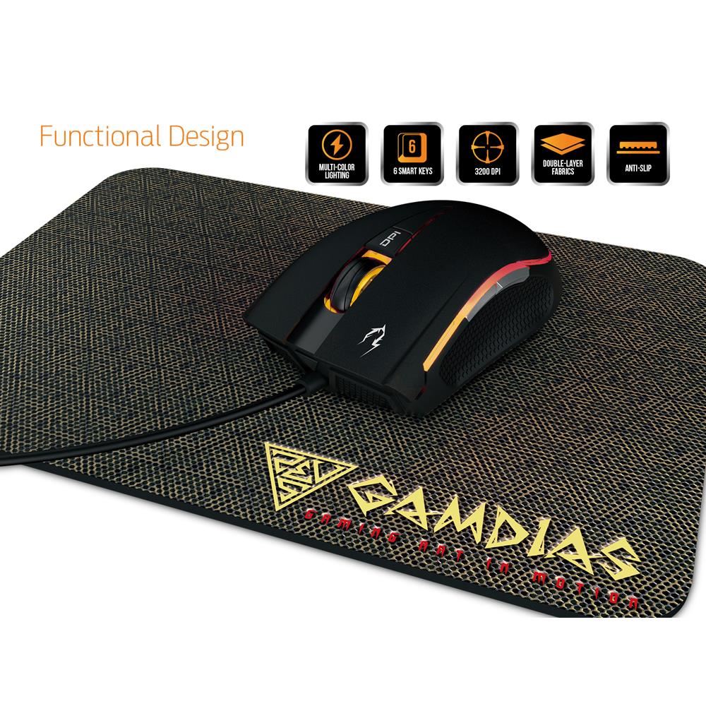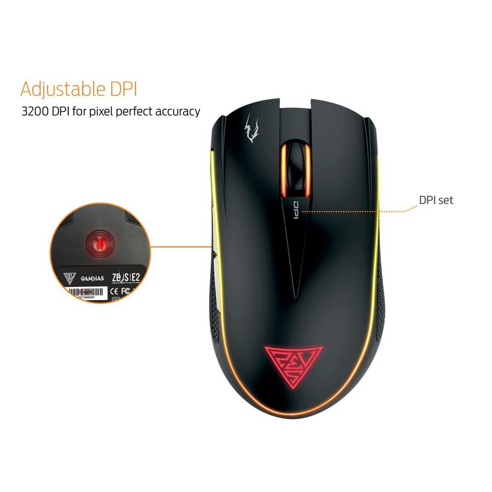 Mouse gaming Gamdias Zeus E2 ilumanare RGB negru + Nyx E1, mouse optic cu fir, iluminare LED RGB, 3200 DPI (1200/1600/2000/3200 DPI), durata de viata micro switch-uri: 3 milioane de click-uri, numar butoane: 6, , benzi laterale din cauciuc pentru o priza mai buna, design ambidextru, lungime cablu: 1.5m, dimensiuni: 118x67x38.5mm, greutate: 105g, include mouse pad GAMDIAS NYX E1 (dimensiuni: 240x180x3mm)