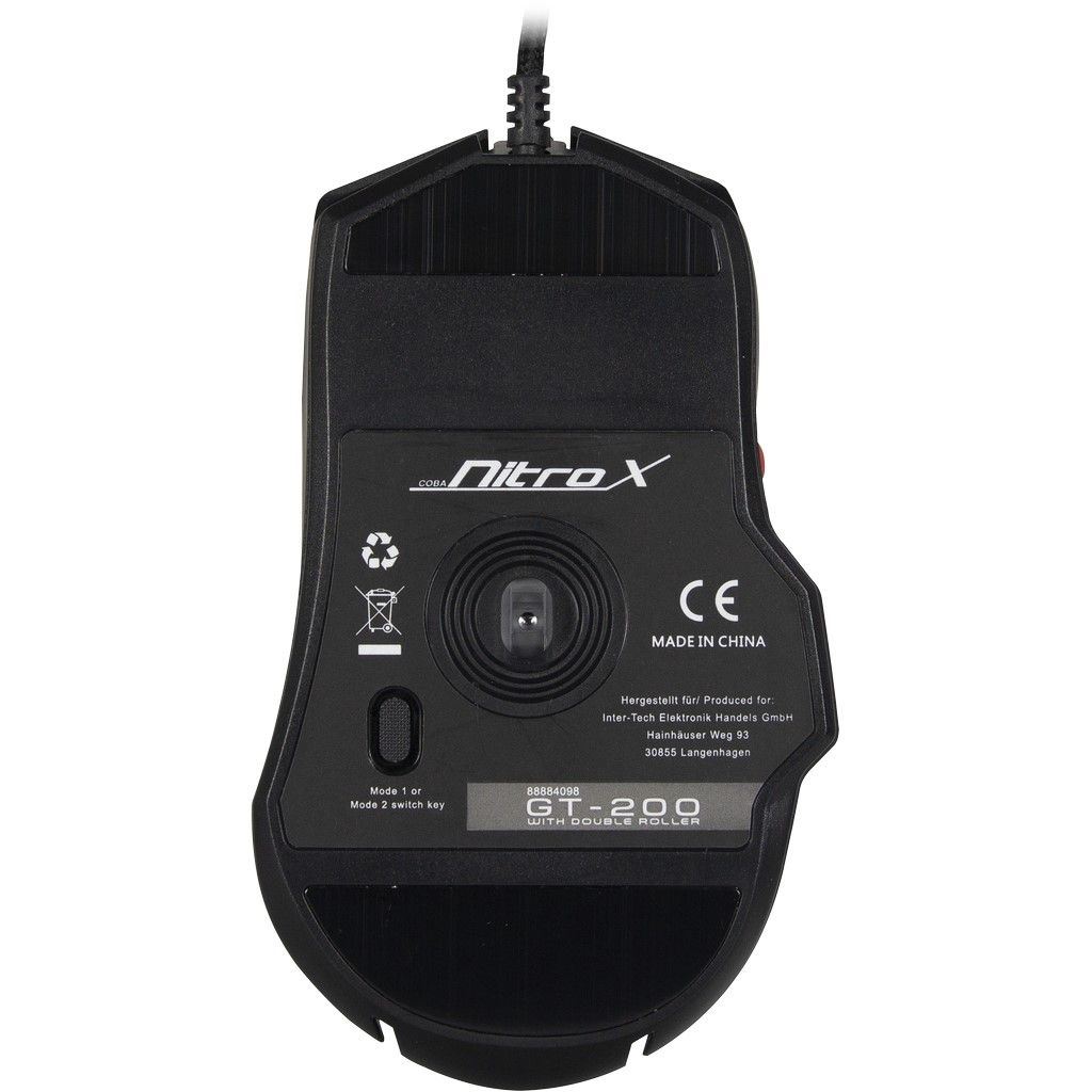 Mouse gaming NitroX GT-200 negru iluminare RGB, mouse optic cu fir, senzor optic:PIXART 3212, iluminare LED RGB (16.8 milioane de culori), 7200 DPI, (500/1600/2400/4000/5000/7200 DPI), polling rate: 1000Hz, durata de viata micro-switch-uri: 5 milioane de click-uri, numar butoane: 9 (programabile), lungime cablu: 1.8m, dimensiuni: 40 x 75 x 126mm, greutate: 143g