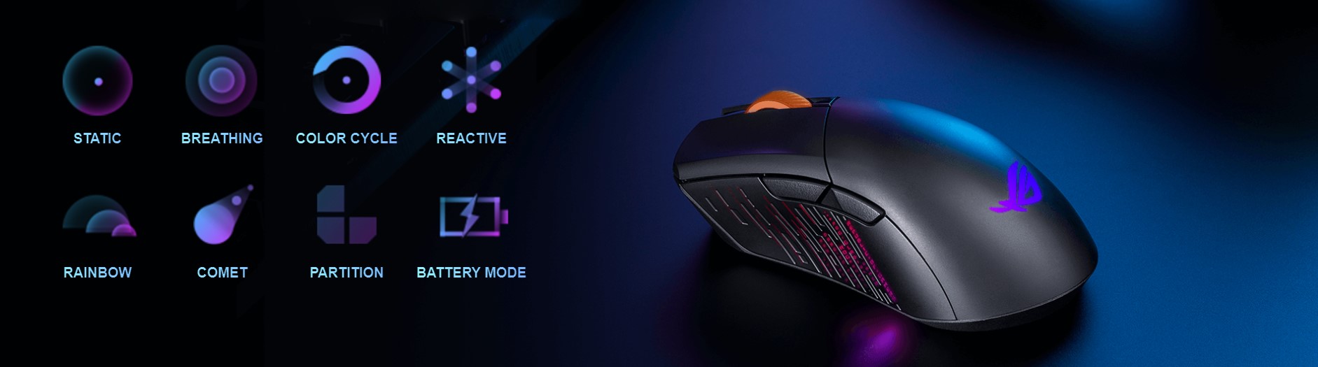 Logo-ul ROG, rotița de scroll și marcajele ROG din lateralul lui ROG Gladius III Wireless dispun de iluminare RGB integrată ROG Aura. Panoul lateral gravat cu laser oferă, de asemenea, efecte speciale de pâlpâire care pot fi personalizate cu culoarea pe care o preferi.