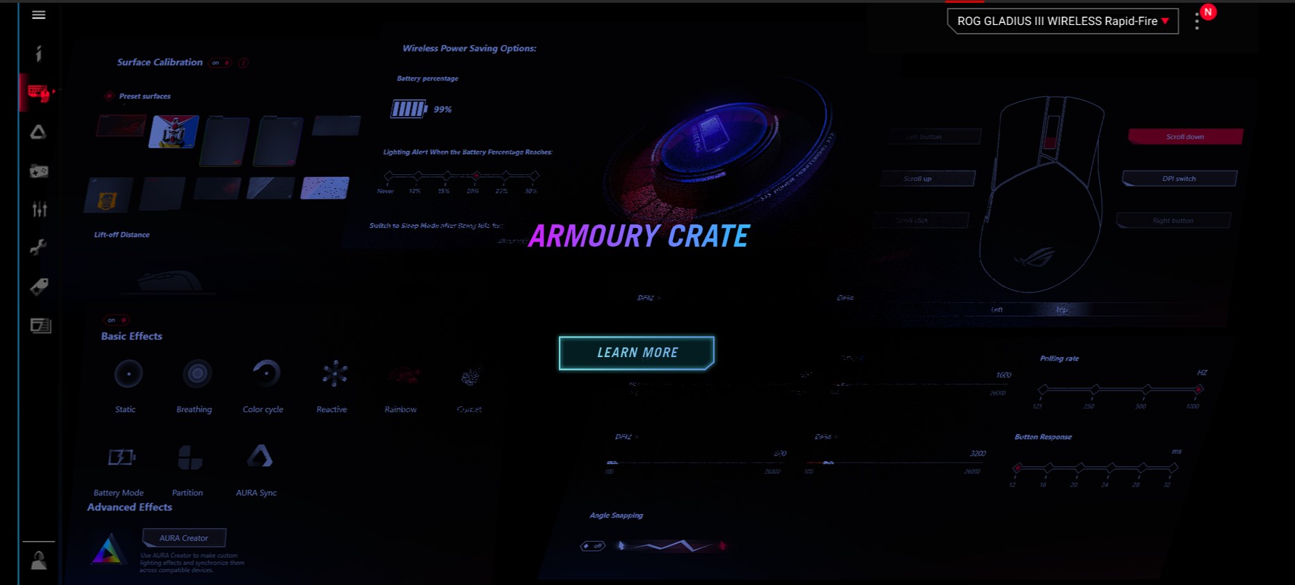 Armoury Crate îți permite să reglezi ușor ROG Gladius lll Wireless pentru a se potrivi cu stilul tău de joc. Ajustează setările de performanță și cele de calibrare a suprafeței, programează și mapează butoane, personalizează efectele de iluminare și multe altele.