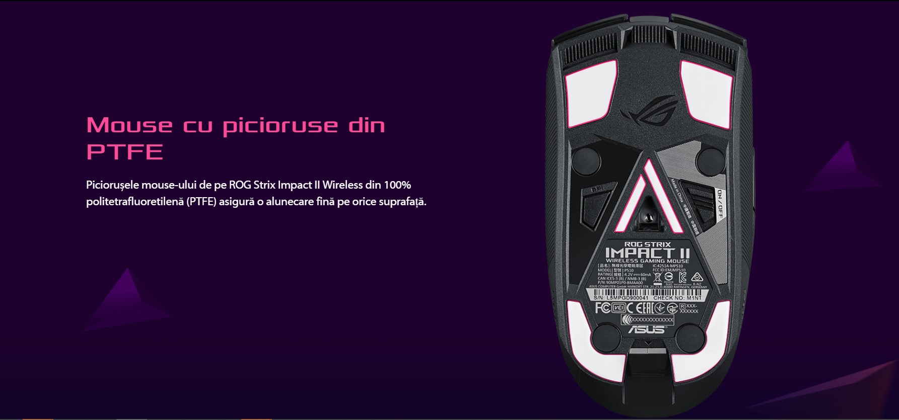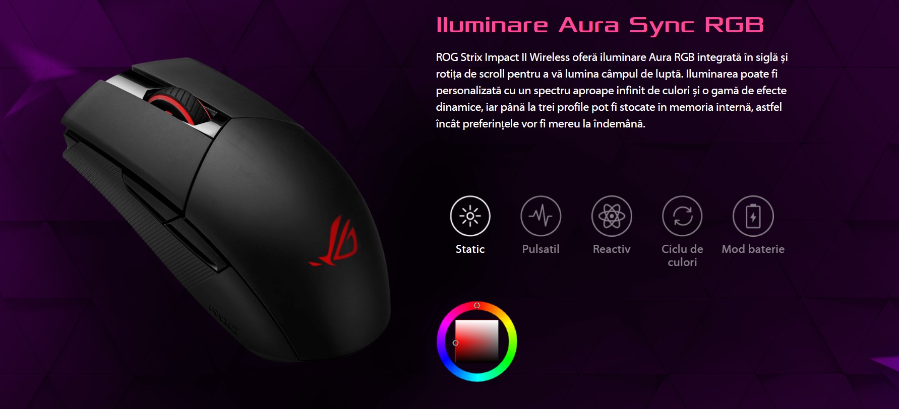 Mouse Gaming ASUS ROG Strix Impact II Wireless, RGB, conectivitate WiFi 2.4 GHz, senzor 16.000 dpi, 5 butoane programabile, design exclusiv al switch-urilor cu socket push-fit, butoane pivotante, iluminare Aura Sync