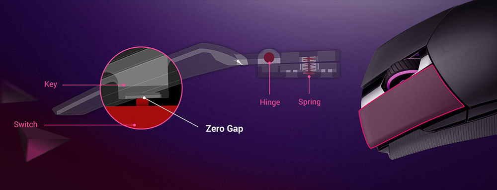 Cursa mai scurta inseamna click-uri mai rapide, motiv pentru care inginerii nostri au echipat ROG Strix Impact II Wireless cu butoane pivotante. Mecanismul utilizeaza arcuri si balamale metalice pentru a echilibra tastele si a minimiza distanta dintre butoane si switch-uri. Rezultatul este o deplasare minima si o intoarcere rapida, asigurand viteza, reactie si consistenta superbe la fiecare click.