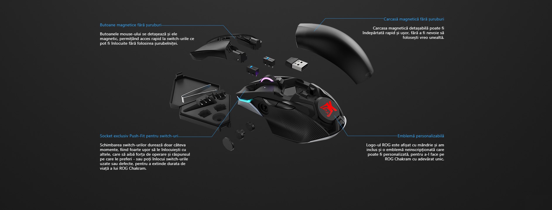 ROG Chakram are o mulțime de caracteristici DIY, de la butoanele și carcasele sale magnetice fără șuruburi la socket-urile exclusive „push-fit” pentru switch-uri și emblemele personalizabile, oferind multă libertate pentru a personaliza Chakram.