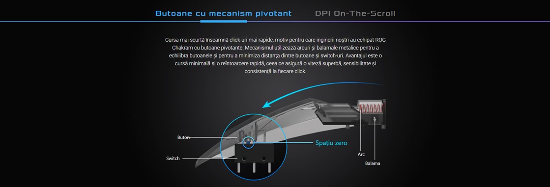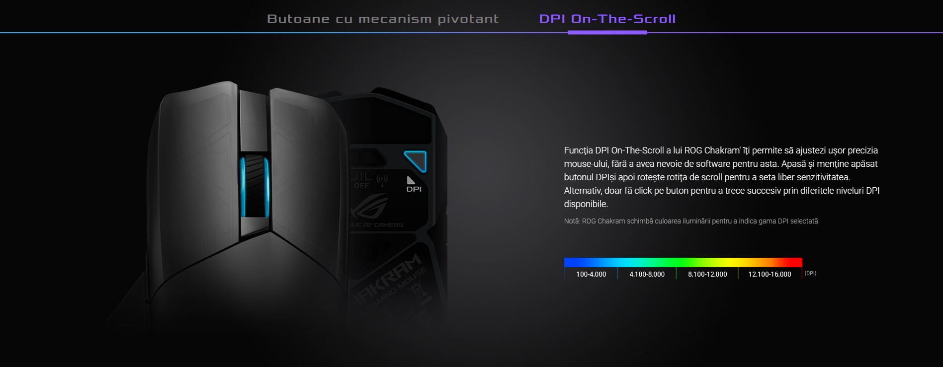 ROG Chakram este un mouse de 16.000 dpi, cu conectare în trei moduri - cu fir, wireless în banda de 2,4 GHz și prin Bluetooth® LE, echipat cu un joystick programabil detașabil, care îți oferă control superior pentru degetul mare. Cu un sistem de încărcare rapidă, plus încărcare wireless Qi, butoane pivotante, carcase detașabile magnetice și o funcție unică DPI On-The-Scroll pentru reglarea facilă a preciziei, Chakram este o nouă forță de temut în arena jocurilor.
