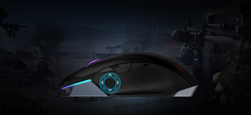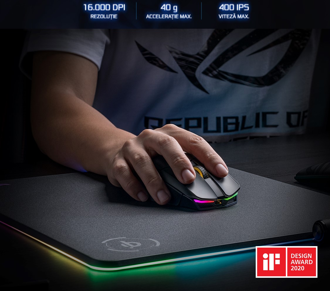 ROG Chakram este echipat cu un senzor optic high-end de gaming, pentru a livra precizia și viteza de care ai nevoie. Senzorul său care urcă de la 100 la 16.000 dpi urmărește impecabil mișcările, până la excelenta viteză de 400 inchi pe secundă (IPS) și la o accelerație de până la 40 g. Te vei bucura și de un răspuns fără latențe, cu o rată de eșantionare de 1.000 Hz atât în modul 2,4 GHz, cât și în cel cu fir, pentru o experiență de joc ultra-fluidă.
