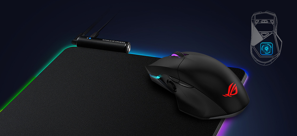 Încarcă ROG Chakram wireless, cu ajutorul unei suprafețe de încărcare compatibilă cu standardul Qi, cum ar fi, de exemplu, ROG Balteus Qi – excelentul nostru companion RGB și mousepad de gaming.