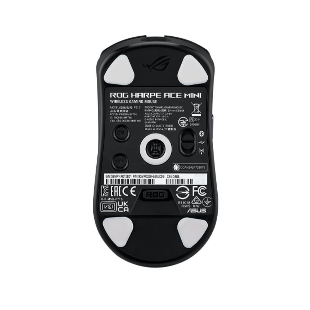 Mouse gaming wireless si bluetooth ASUS ROG Harpe Mini negru, bluetooth 5.1 (se pot conecta pana la 3 device-uri pe bluetooth), 42000 DPI, acceleratie 50G, 750IPS, polling rate: 8000Hz, senzor optic ROG AimPoint Pro, numar butoane: 5 (5 programabile), include program pentru configurare (macro-uri, profile, mod iluminare, etc.), compatibil Asus Aura Sync, picioruse de teflon ROG Omni, autonomie: aproximativ 79 ore (in mod cu iluminare breathing), conector USB placat cu aur, cablu detasabil ROG Paracord, lungime cablu: 2m, dimensiuni: 117x63x37mm, greutate: 49g (fara dongle si cablu)