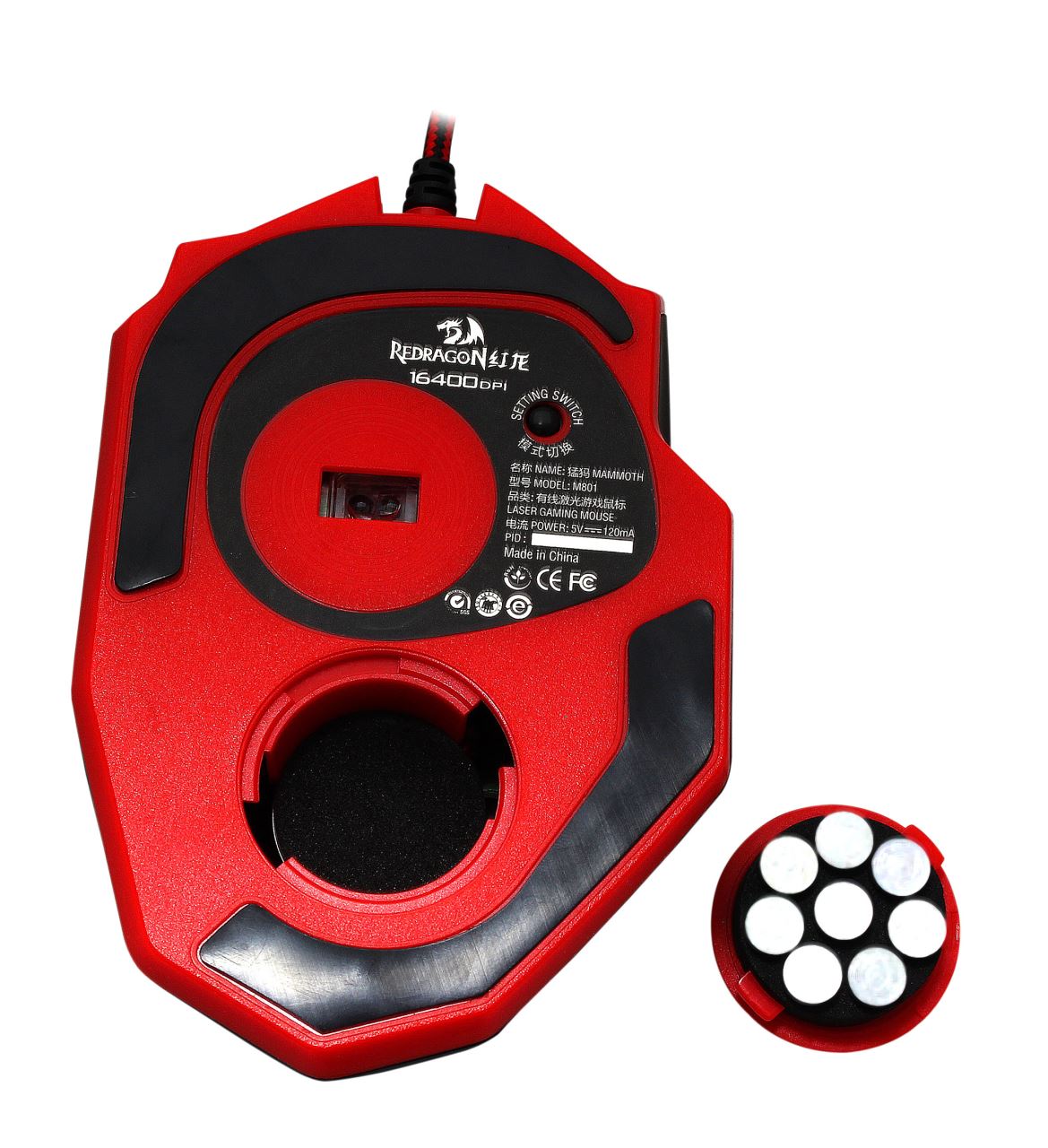 Redragon Mammoth Black, 16400 DPI, 12000 FPS, acceleratie 30G, polling rate: 1000/500/250/125Hz, senzor laser Avago A9800, micro switch-uri Omron (durata de viata: 5 milioane click-uri), numar butoane: 10 (9 programabile), 5 moduri de iluminare (16 milioane de culori disponibile), include program pentru configurare (macro-uri, profile, mod iluminare, etc.), picioruse de teflon, conector USB placat cu aur, lungime cablu: 1.8m, dimensiuni: 121x81x41mm, greutate: 155g (incluzand greutati 2.4g x 8 bucati), USB