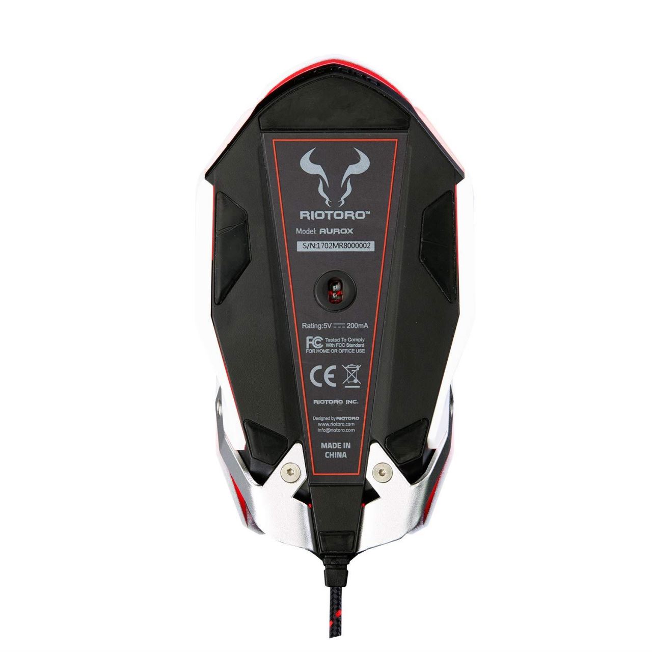 Mouse Riotoro Aurox negru iluminare RGB, 10000 DPI, polling rate: 1000Hz, senzor optic PixArt PWM3330, numar butoane: 8 (8 programabile), 16 milioane de culori disponibile, include program pentru configurare (profile, mod iluminare, etc.), picioruse de teflon, conector USB, cablu textil, dimensiuni: 134x73x48mm, greutate: 100g
