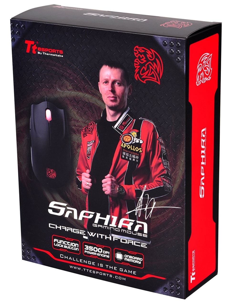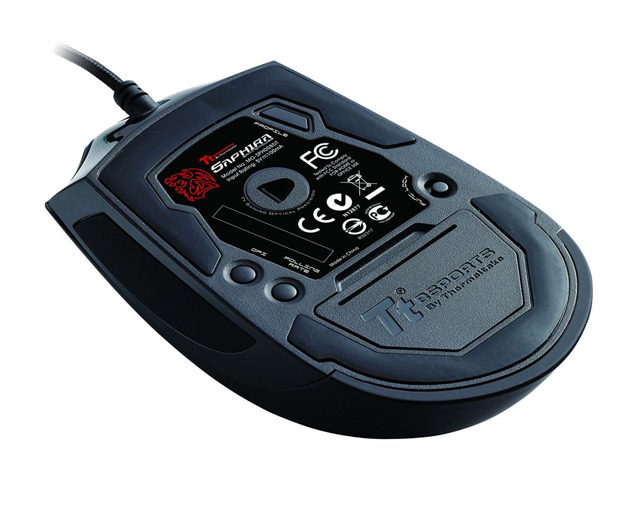Tt eSPORTS SAPHIRA, 100-3500 DPI, senzor laser T.P.G. (Tt Pro Grade), 32kb memorie on-board (5 profile, 5 taste macro, salvarea setarilor), switch-uri Omron, greutati: 4.5g x5, lungime cablu: 1.8m, picioare de teflon, conector USB placat cu aur, dimensiuni: 115 x 63 x 38mm, USB