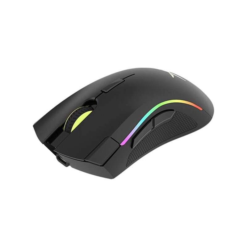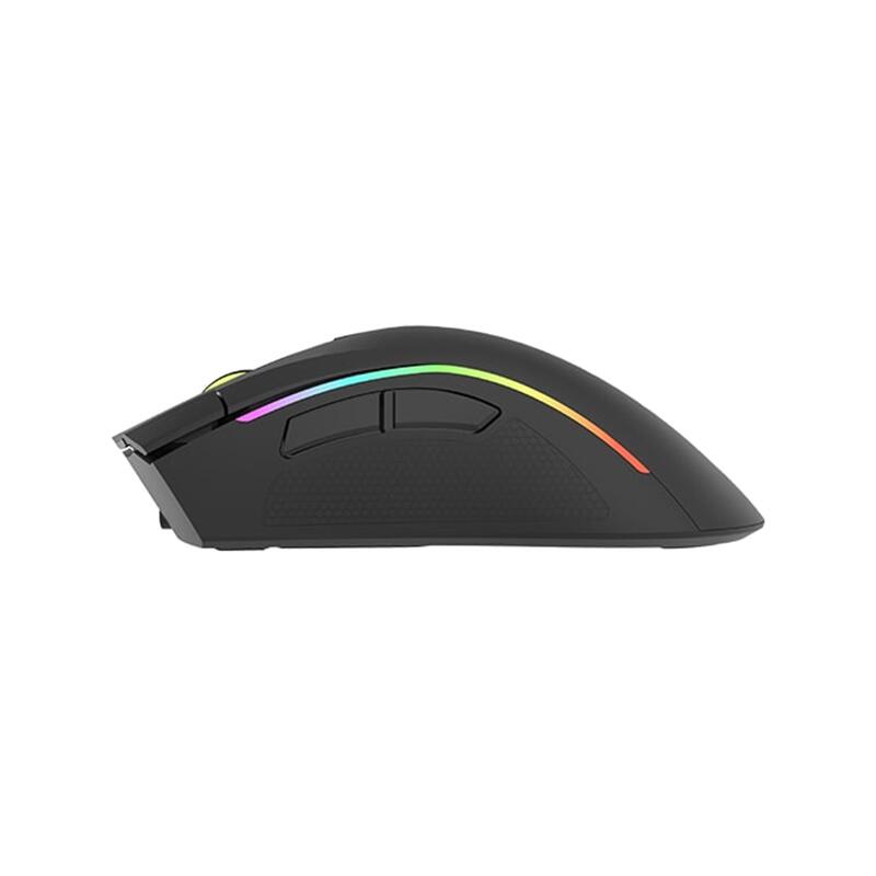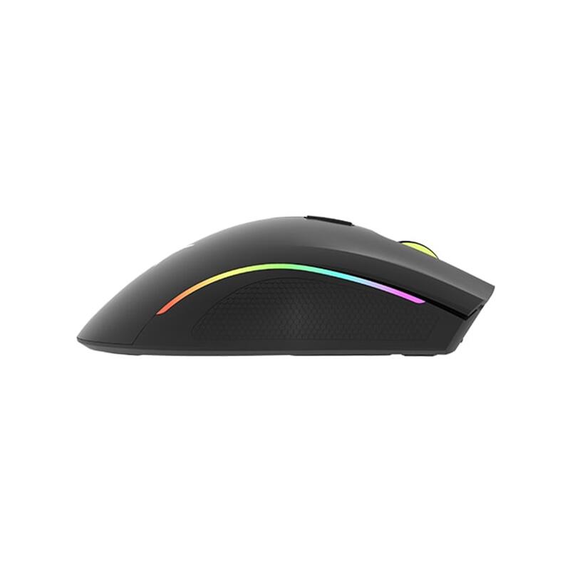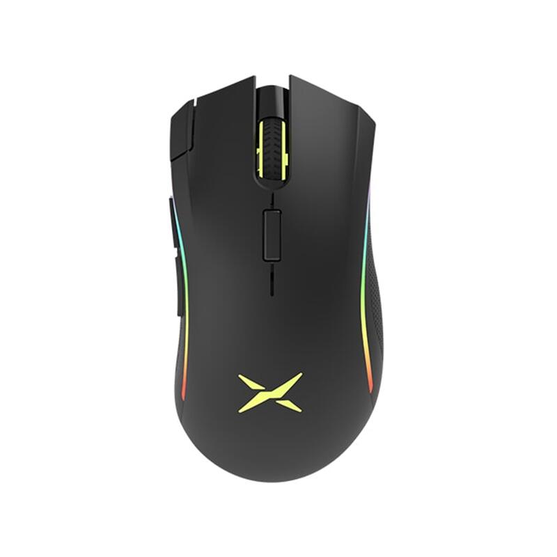 Mouse wireless gaming Delux M625 PLUS negru iluminare RGB, senzor optic Pixart PMW3325, conexiunde 2.4Ghz, 400/800/1600/3200/5000/10000 DPI, polling rate: 1000Hz, acceleratie: 40G, micro switch-uri cu durata de viata de 5 milioane click-uri, acumulator de 500mAh, numar butoane: 7, buton Rapid Fire, lungime cablu: 1.6m, conector USB Type-C, nano receiver USB, dimensiuni: 131x69x42mm