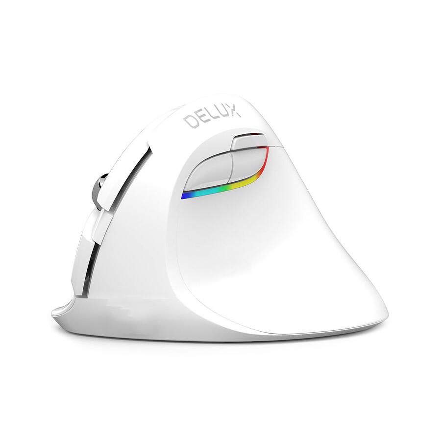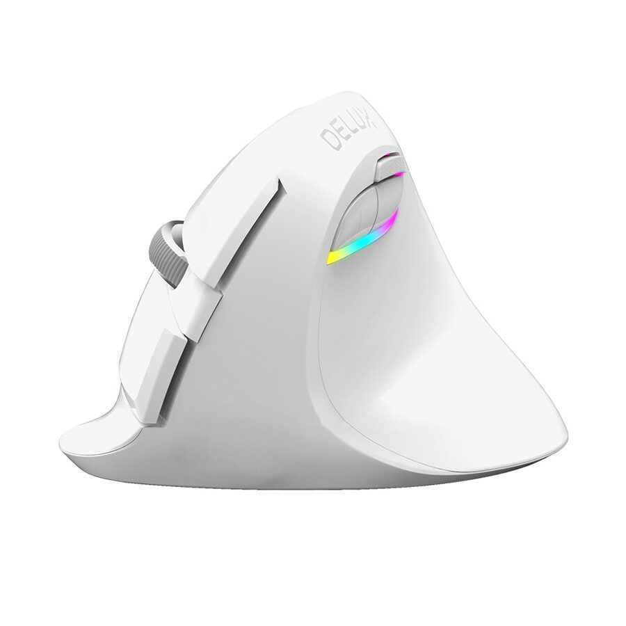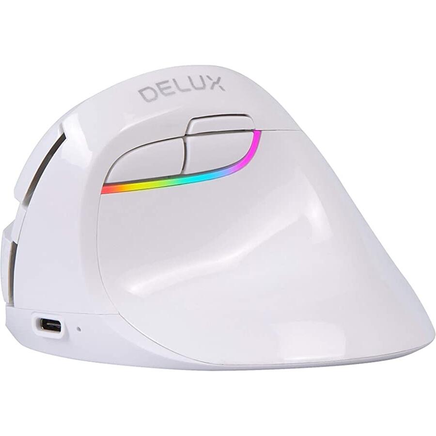 Mouse wireless si bluetooth Delux M618 mini alb pentru stangaci, 4000/2400/1600/1200(implicit)/800 DPI, senzor optic: Pixart PAW 3212, polling rate: 125Hz, acceleratie: 10G, numar butoane: 5, buton ON/OFF, iluminare RGB, conectivitate: bluetooth sau 2.4Ghz, acumulator 500mAh, conector: dongle USB, dimensiuni: 115x81x75.2mm, greutate: 113g
