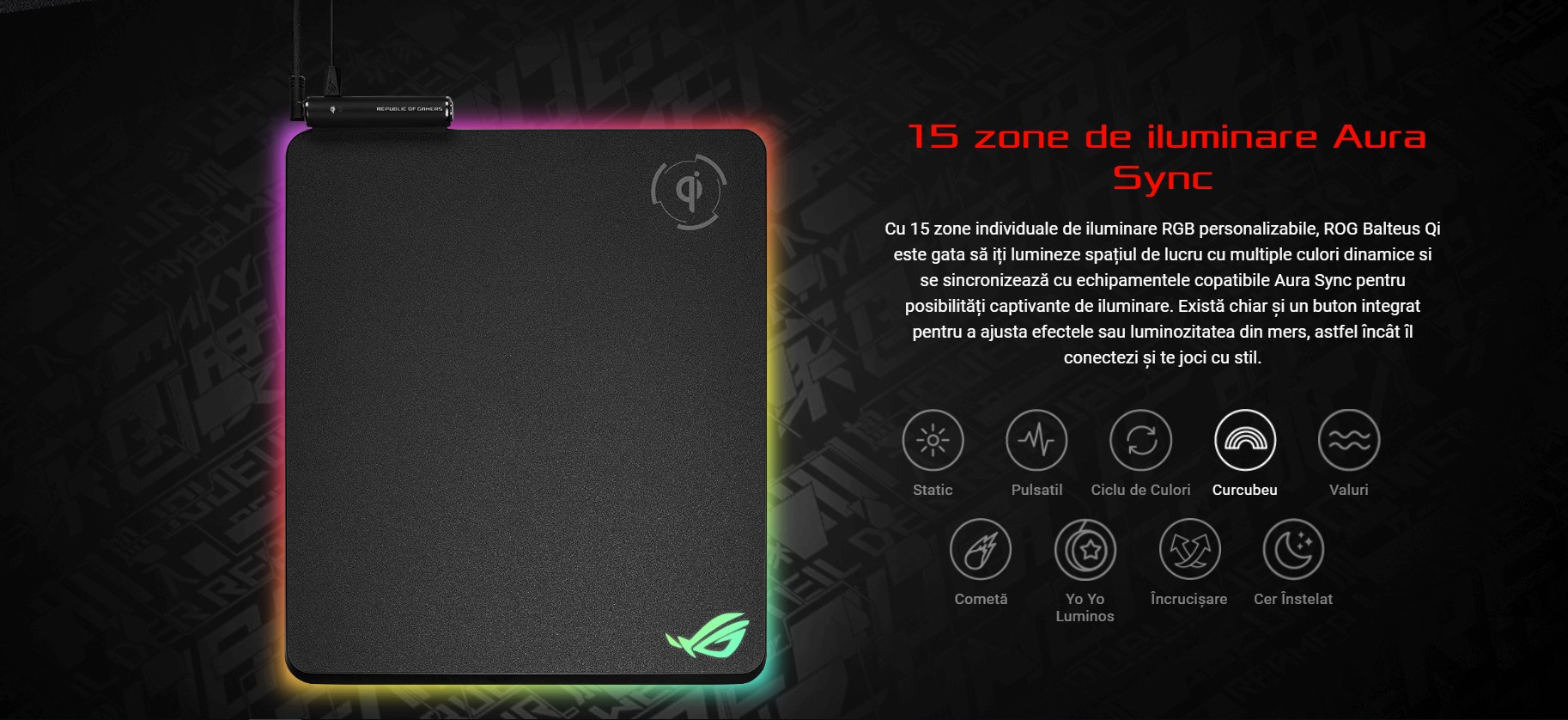Mousepad Gaming ASUS Balteus Qi, RGB, 15 zone cu iluminare Aura Sync, port USB, bază cauciucată anti-alunecare, încărcare wireless Qi