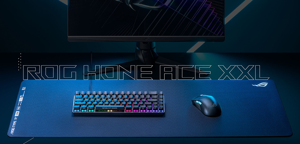 Mousepad gaming ASUS ROG HONE ACE XXL, suprafață hibridă din pânză concepută pentru consistență și control optim, bază realizată dintr-un cauciuc extra-moale, anti-alunecare, strat protectiv nano pentru o suprafata rezistenta la apa, ulei si praf