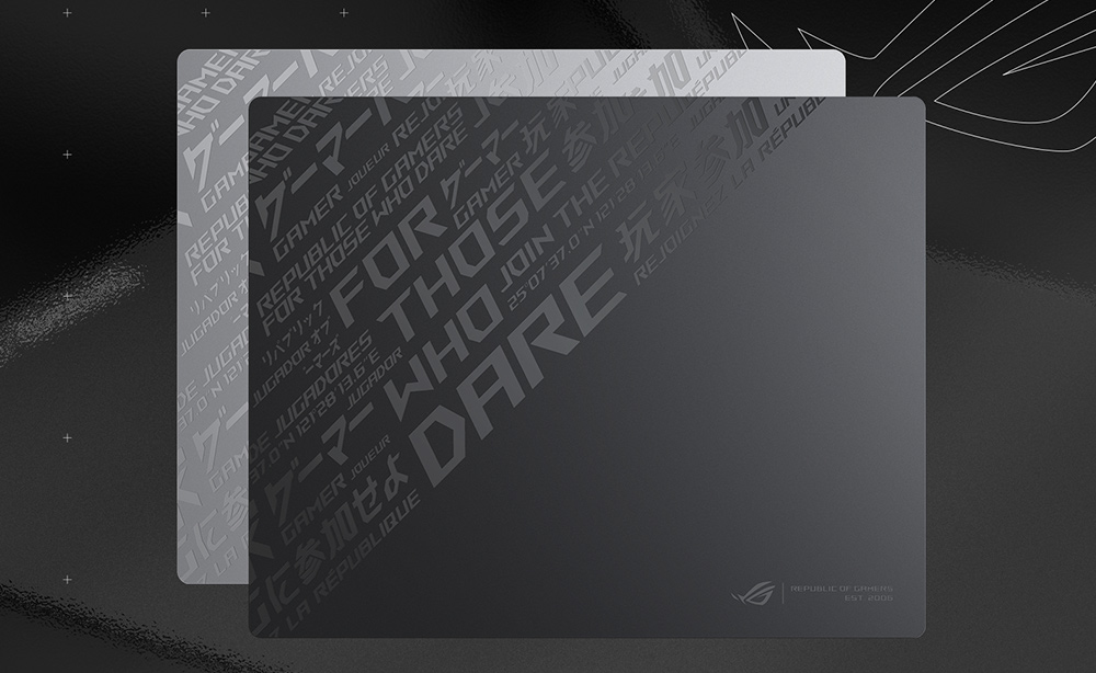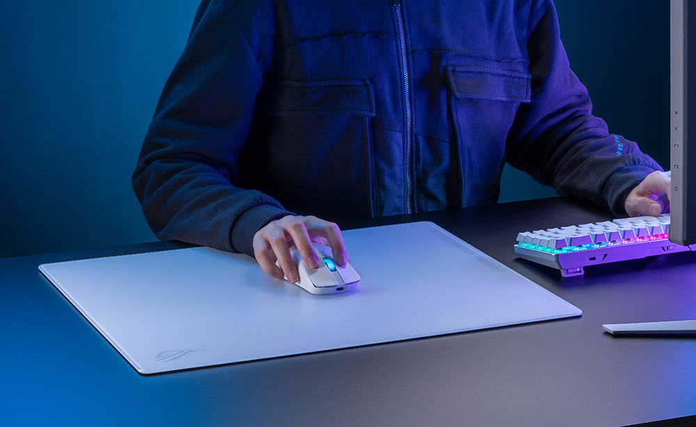 Mousepad gaming ASUS ROG MOONSTONE ACE L, fabricat din sticlă securizată rezistentă, cu o suprafață ultra-lină optimizată pentru alunecări rapide și consistente ale mouse-ului și o bază din silicon anti-alunecare