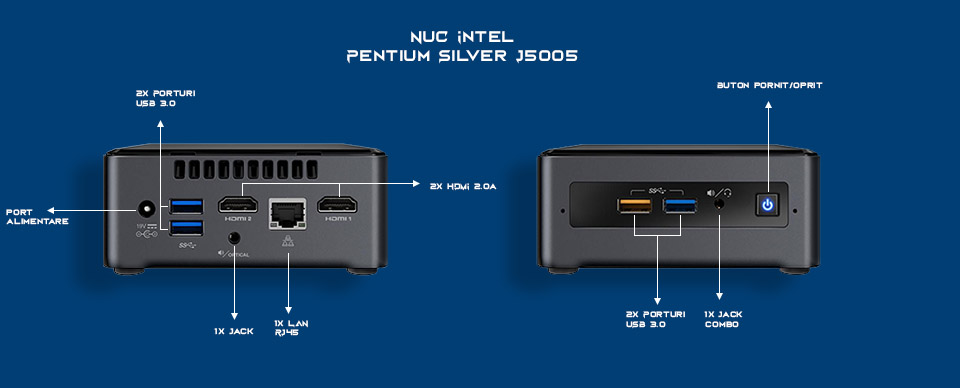 Mini PC Intel® NUC June Canyon PC Barebone cu procesor Intel® Pentium® Silver Processor J5005 pana la 2.80 GHz, 2 X DDR4 8GB max, HDD/SSD 2.5 inch