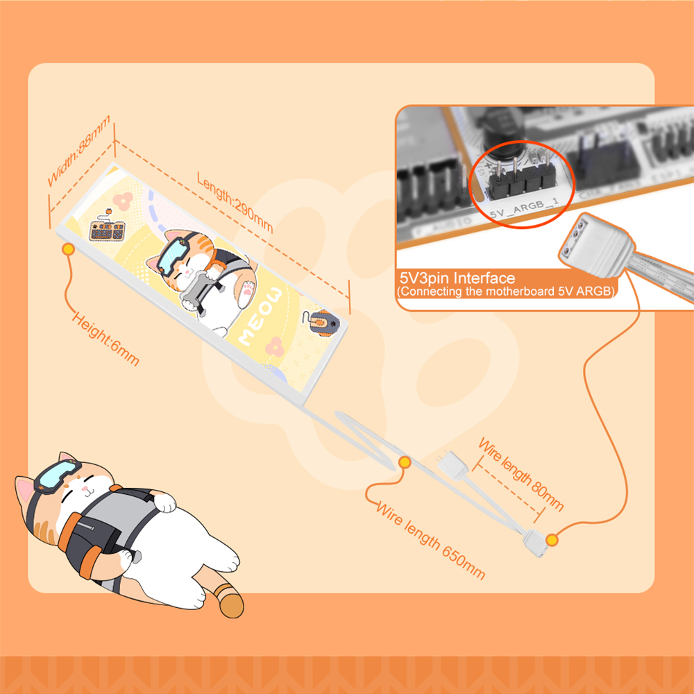 Panoul Segotep Meow aRGB are un design modern si elegant, destinat sa completeze estetic orice carcasa de PC. Cu dimensiunile de 290x88x6mm, acest panou se integreaza perfect in carcasele compatibile Memphis-S si Memphis-S Meow, adaugand un element de iluminare atragator fara a ocupa prea mult spatiu. Grosimea de doar 6mm il face discret, dar in acelasi timp, suficient de vizibil pentru a crea efecte luminoase spectaculoase.