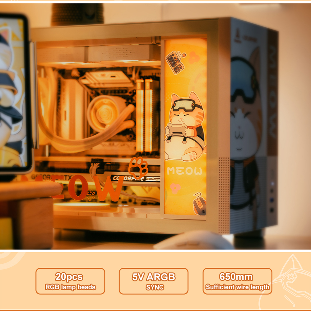 Panoul Segotep Meow aRGB nu doar ca ofera o estetica imbunatatita, dar si contribuie la experienta vizuala generala a utilizatorului. Cele 20 de LED-uri aRGB sunt capabile sa produca o gama larga de culori si efecte, de la culori vibrante si saturate la efecte de tranzitie si pulsatie. Iluminarea uniforma si intensa creeaza o atmosfera unica, fie ca este vorba de sesiuni de gaming intense sau de o simpla utilizare zilnica.