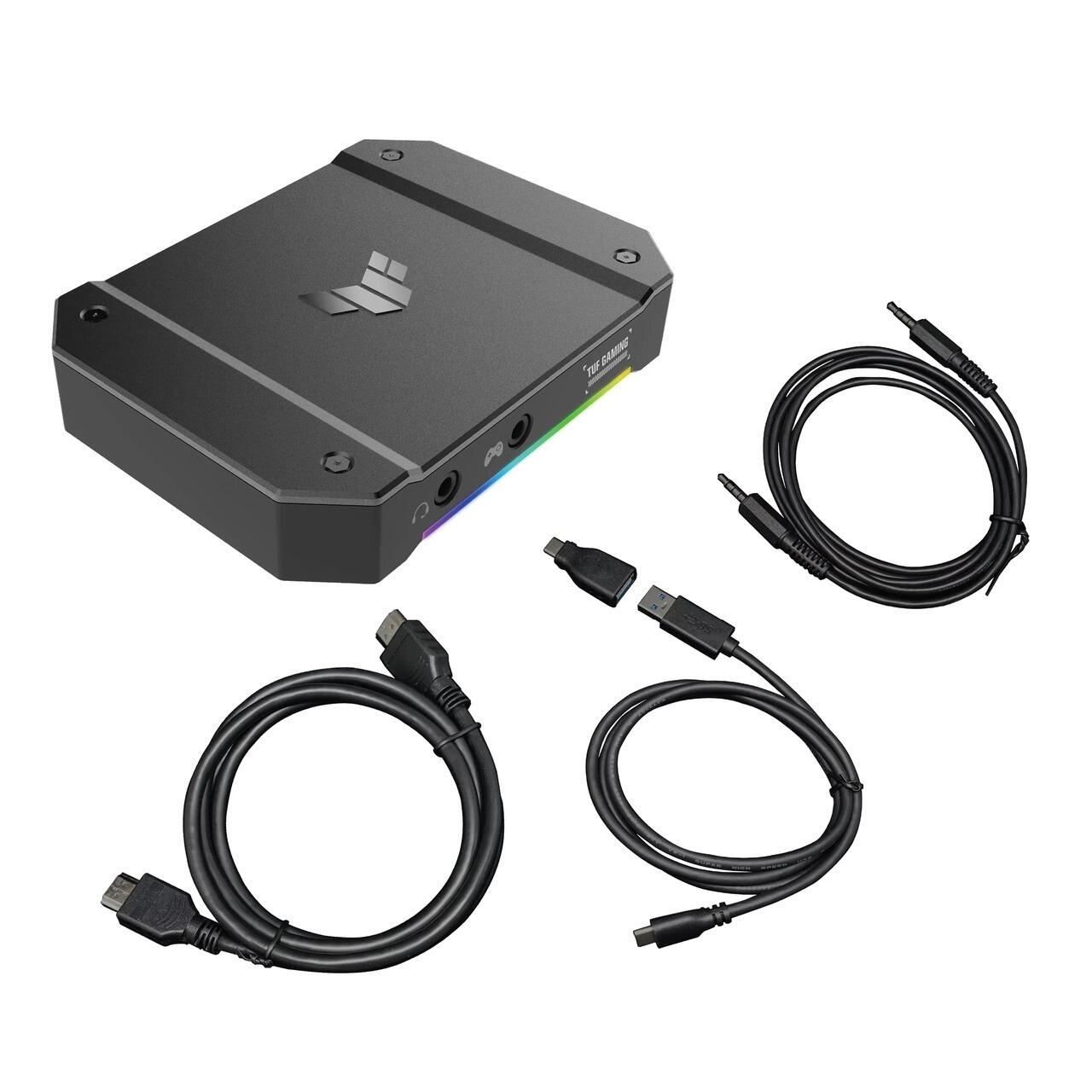 Placa de captura ASUS TUF BOX-4KPRO, suport video passthrough: 4K pana la 144Hz / 2K pana la 144Hz / Full HD pana la 240Hz, suport streaming video: 4K pana la 60fps / 2K pana la 120fps / Full HD pana la 120fps, 2 jack-uri 3.5mm pentru a conecta un controller si o pereche de casti in “party mode”, certificat OBS Studio, 2 port-uri HDMI 2.1 (un port pentru input, unul pentru output de semnal), un port USB 3.2 Gen 1x1 Type-C, format compatibil: NV12 / YUY2 / MJPEG / P010, compatibil Xbox, Playstation, Nintendo Switch si PC, iluminare RGB, dimensiuni: 105x80x21mm, greutate: 161g