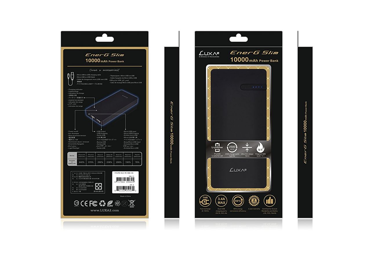 LUXA2 EnerG Slim 10000mAh Power Bank, capacitate: 10000mAh (acumulator Li-Polymer), input: 5V 1-2A, output: 5V 2.4A / 5V 1A (Max 3.4A), posibilitatea incarcarii simultane a doua aparate, invelis exterior din plastic ABS rezistent la foc (UL94/V-1), protectie la suprasarcina (Overload Protection), include cablu microUSB-USB, conectori: microUSB (input), USB (putput), dimensiuni: 136x63x15.8mm, greutate: 222g