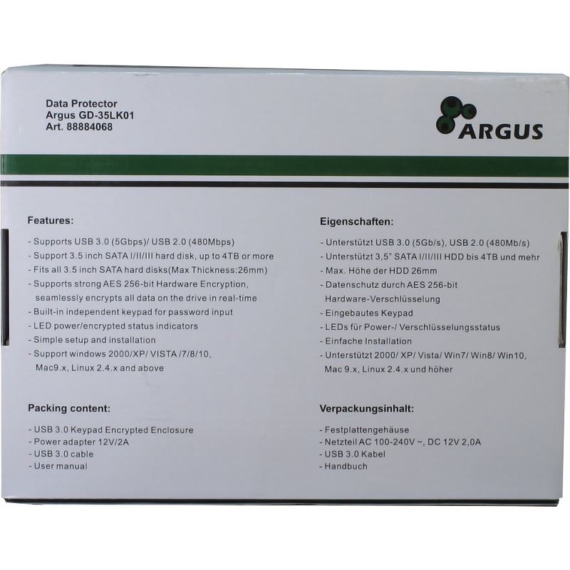 Inter-Tech Argus Data Protector GD-35LK01 Encryption USB 3.0, criptare AES 256-bit hardware a datelor, compatibil cu HDD 3.5” SATA I/II/III (grosime maxima 26mm), capacitate maxima: 16TB, conectivitate USB 3.0, constructie din aluminiu, include cablu USB 3.0, plug and play, dimensiuni: 33 x 122 x 193mm