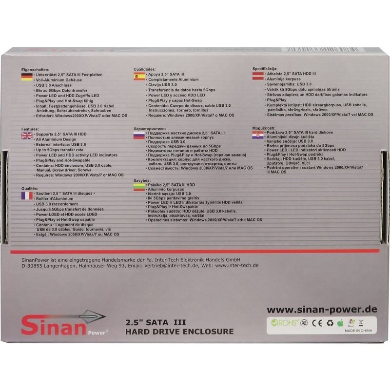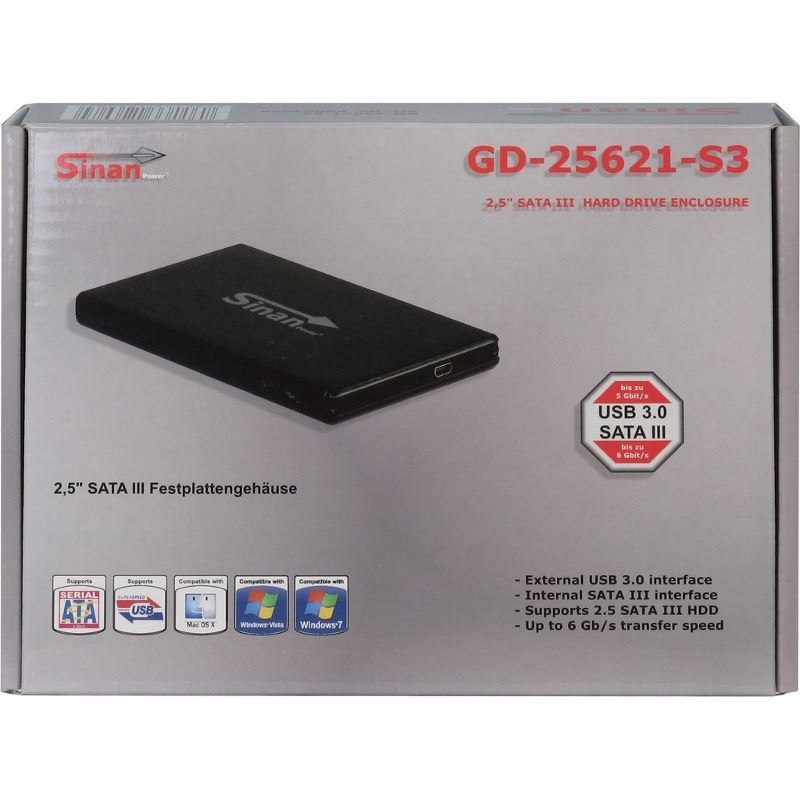 Inter-Tech SinanPower GD-25621-S3 USB 3.0, compatibil cu HDD 2.5” SATA (grosime maxima 9.5mm), capacitate maxima: 4TB, conectivitate USB 3.0, constructie din aluminiu, include cablu USB 3.0, plug and play, dimensiuni: 78 x 13 x 132mm