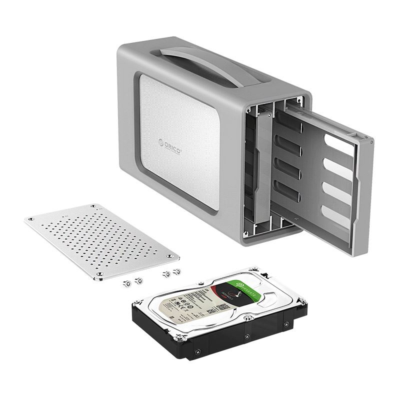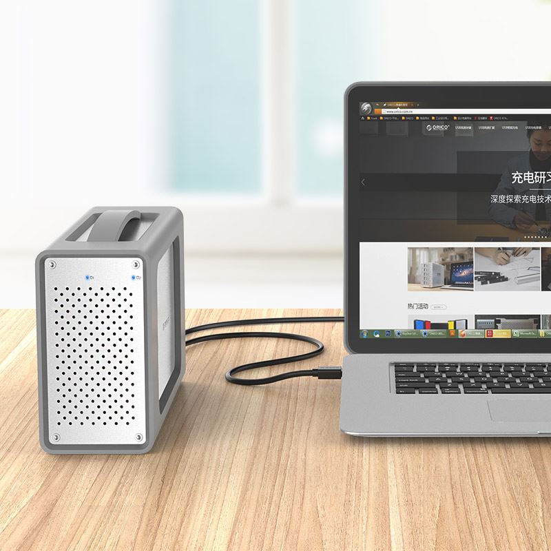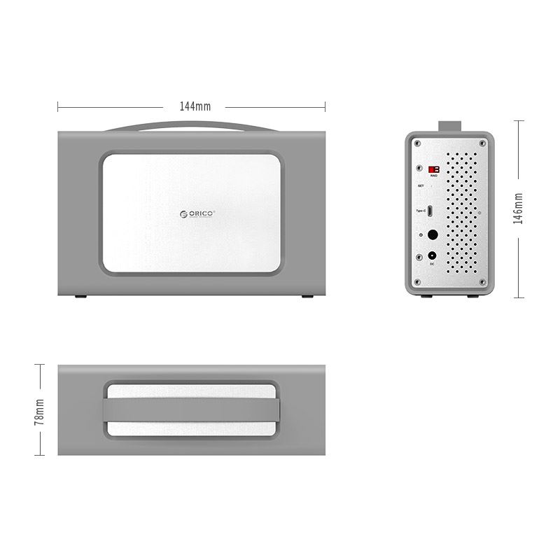 Rack HDD Orico RS200RC3 USB 3.1 2x 3.5” RAID argintiu, protocol RAID 0/1/JBOD, compatibil cu 2x HDD 3.5” SATA, capacitate maxima: 20TB (2x 10TB) , conectivitate USB 3.1 6Gbps, constructie din aluminiu si silicon, include cablu USB 3.1, plug and play, protectii: shock proof / overheat protection, inlude alimentator, compatibilitate: Windows/Mac/Linux/Unix, dimensiuni: 137x232.3x72mm