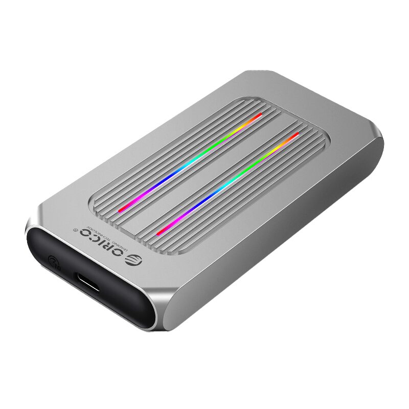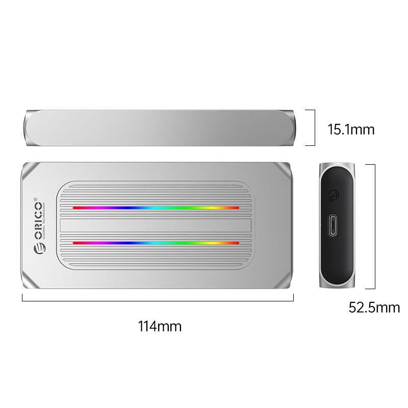 Rack SSD Orico M2R1-G2 USB3.2 GEN2 NVMe M.2 gri iluminare RGB, compatibil cu SSD NVMe M.2, conectivitate USB3.2 GEN2, constructie din aluminiu, capacitate maxima: 4TB, suporta M.2 M-KEY (NVMe), dimensiuni M.2 compatibile: 2230/2242/2260/2280, include cablu USB3.2 GEN2 10Gbps Type-C – Type-C (cu adaptor pentru USB Type A) (30cm), conectori: 1x USB Type-C, compatibilitate: Windows/Mac OS/Linux/Android, dimensiuni: 114x52.5x15.1mm