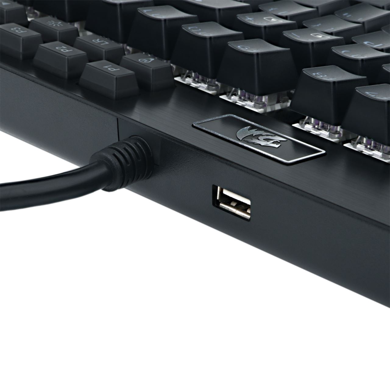 Redragon Yama Black tastatura mecanica cu switch-uri rosii, sasiu de aluminiu, toate tastele fara conflict (n-key rollover), iluminare LED RGB a tastelor (7 culori disponibile, 5 moduri de iluminare, reglarea intensitatii, posibilitatea iluminarii numai anumitor taste – 3 profile de iluminare), 6 taste multimedia, 12 butoane programabile, functie de inregistrare a macro-urilor, 2 viteze de input a tastelor, tasta WIN poate fi dezactivata in timpul jocurilor, conector USB placat cu aur, hub USB pe tastatura