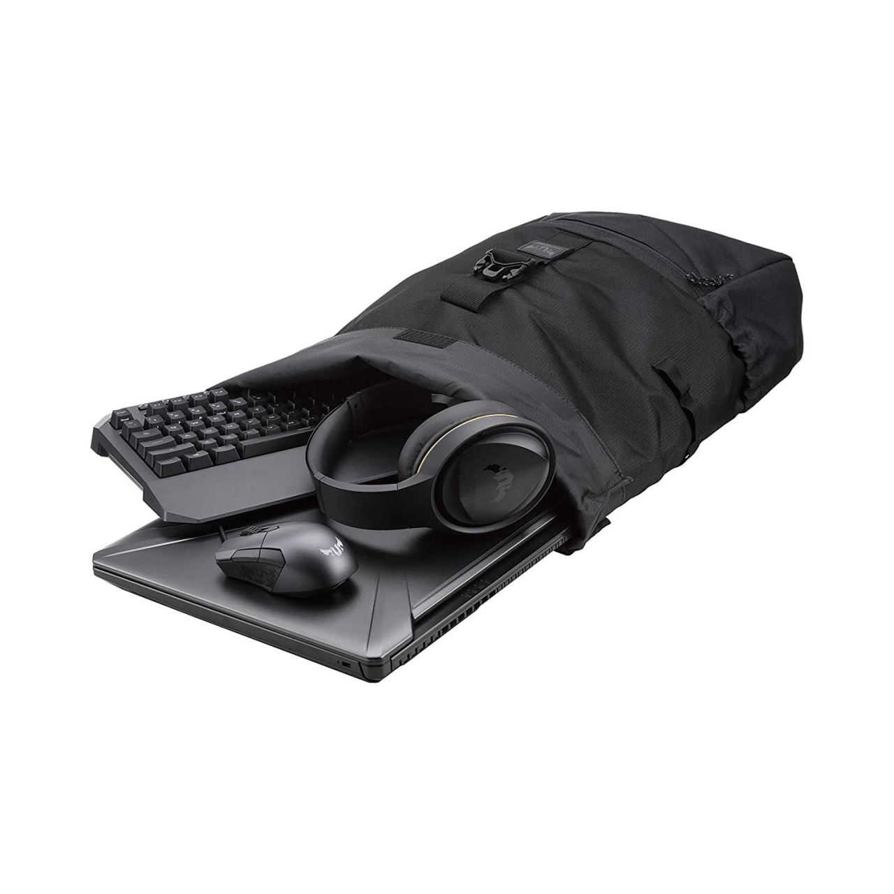 Rucsac Asus TUF BP1700 negru, material: 900D polyester, 600D polyester si 210D polyester, compatibil laptop-uri de maxim 17.3 inch, un compartiment principal, 1 buzunar mic exterior pe partea din fata si 2 buzunare laterale fara fermoar, greutate: 0.66kg, dimensiuni: 300x460x145mm