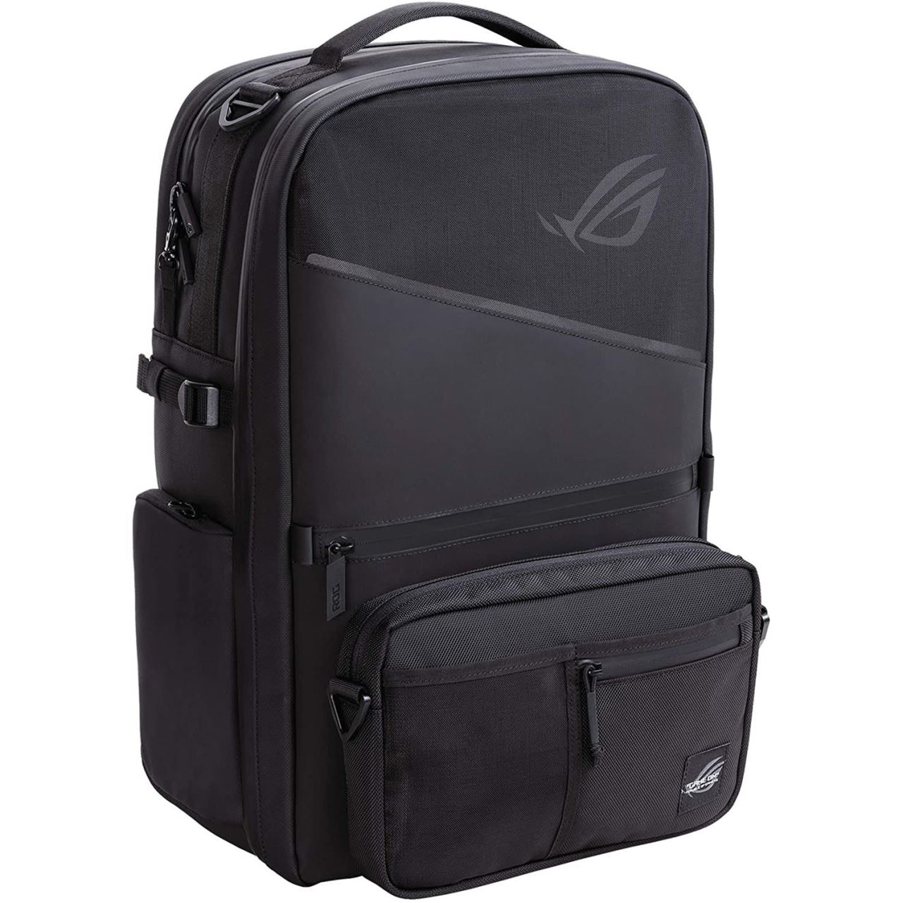 Rucsac modular Asus ROG BP3703 Core negru, logo-ul si banda de sub logo sunt relfectorizante, material: 1680D Reversed Polyester, TPU si 210D Ripstop Polyester, compatibil laptop-uri de maxim 17 inch, compartimentul principal are spatii individuale destinate diverselor accesorii gaming: tastatura, mouse, casti, accesorii si tablete, 2 buzunare mici exterioare pe partea din fata care pot fi desfacute si pot fi folosite pe post de borseta folosind prinderea de umar care vine impreuna cu rucsacul, 1 buzunar pentru accesorii si 2 buzunare laterale cu fermoar, greutate: 1.9kg, dimensiuni: 300x480x170mm