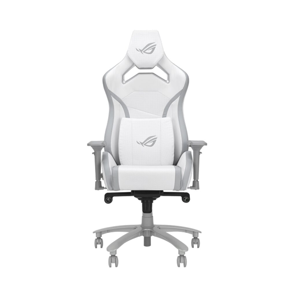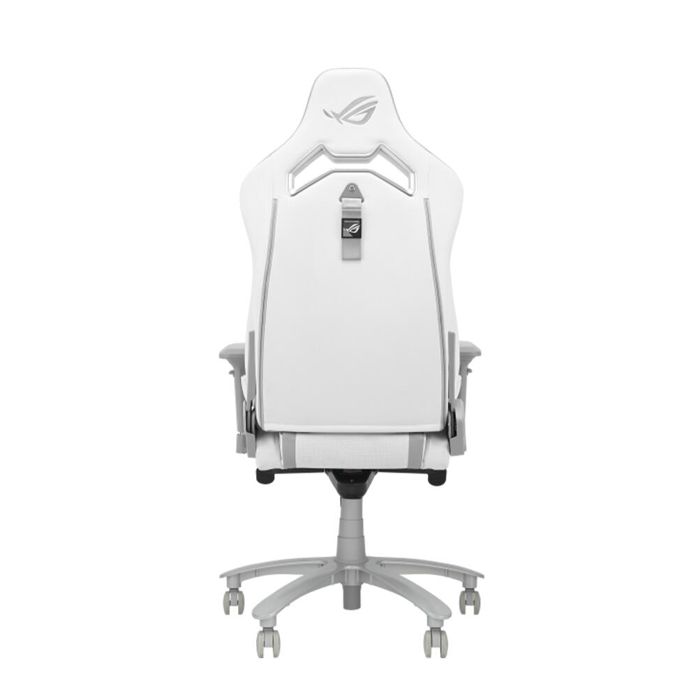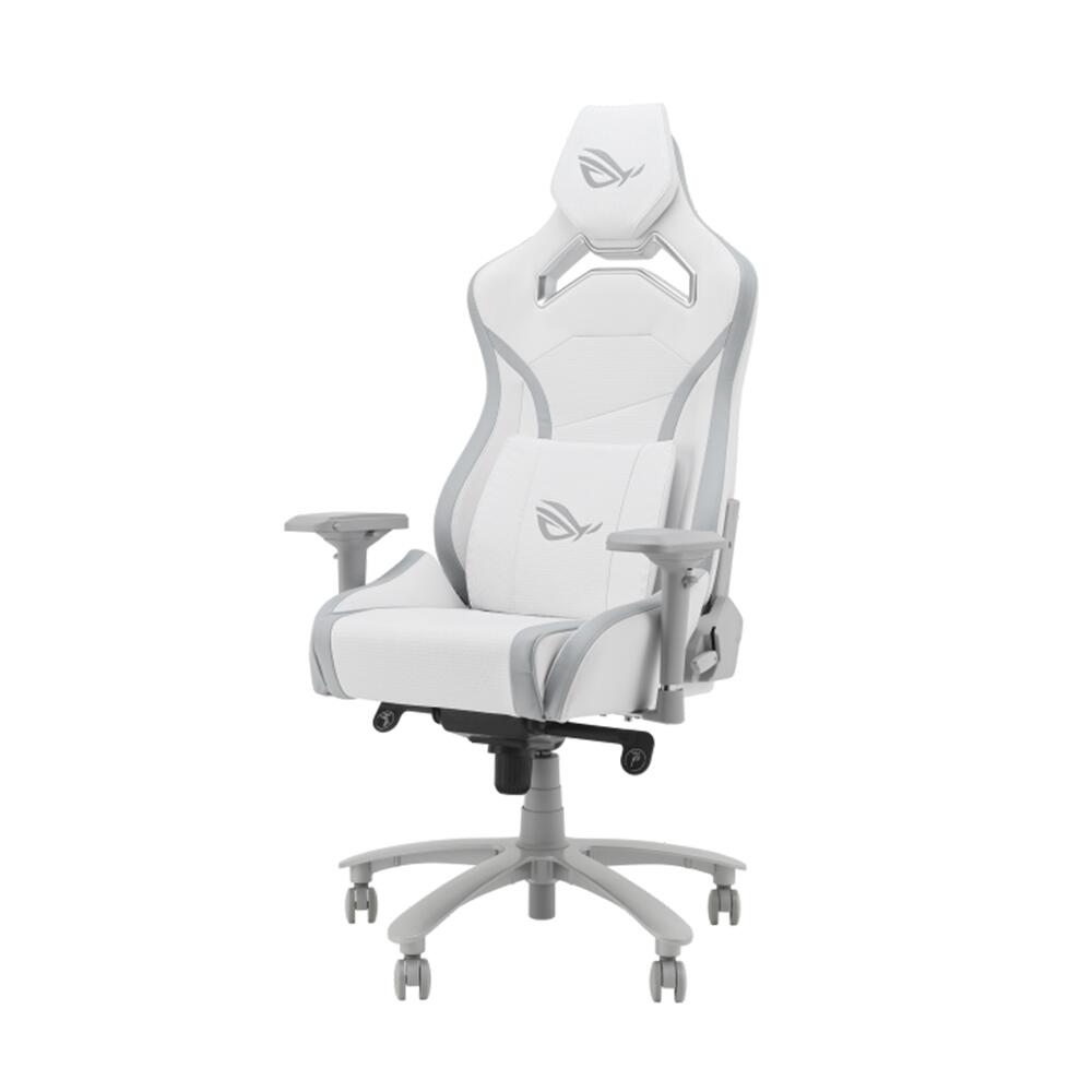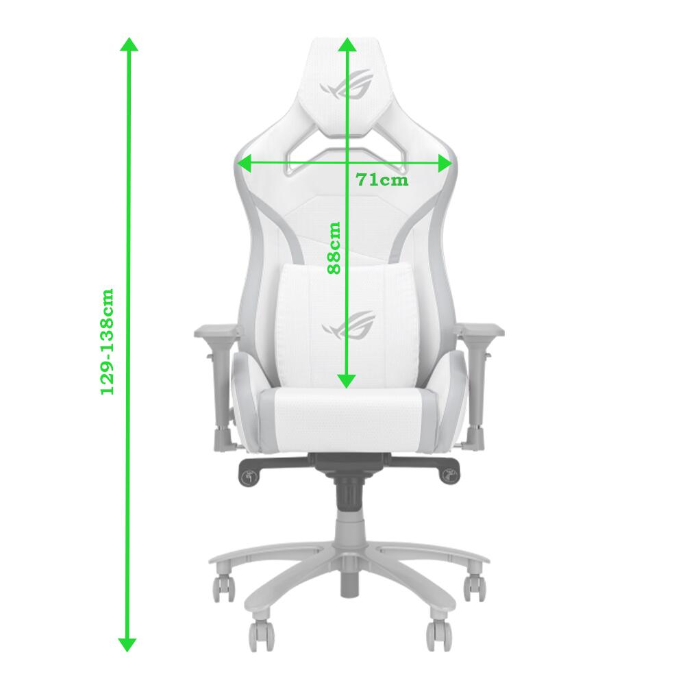 Scaun gaming ASUS ROG Chariot X Core alb, permite diverse reglaje: inaltime, inclinare 155°, rotire 360°, manere 4D, material captuseala: PU, material baza: aliaj aluminiu, material schelet: otel, mecanism de inclinzare de tip “Z” (tilt lock: 15°), pernitele sunt confectionate din spuma cu memorie, tetiera este ajustabila pe inaltime (7cm), echipat cu piston cu gaz clasa 4, latime scaun: 71cm, adancime scaun: 70cm, inaltime sezut reglabila: 45-54cm, inaltime spatar: 88cm, latime spatar: 71cm, inaltime scaun: 129-138cm, greutate maxima admisa: 136kg, inaltime recomandata: 160-190cm