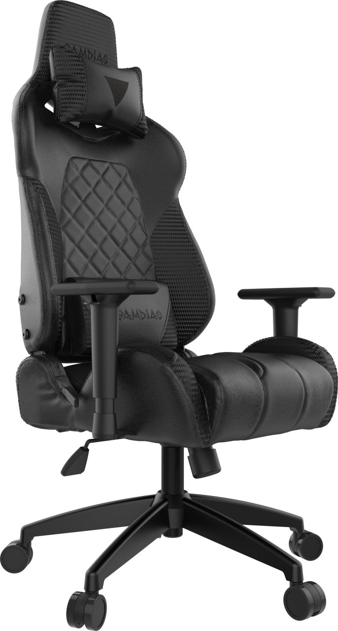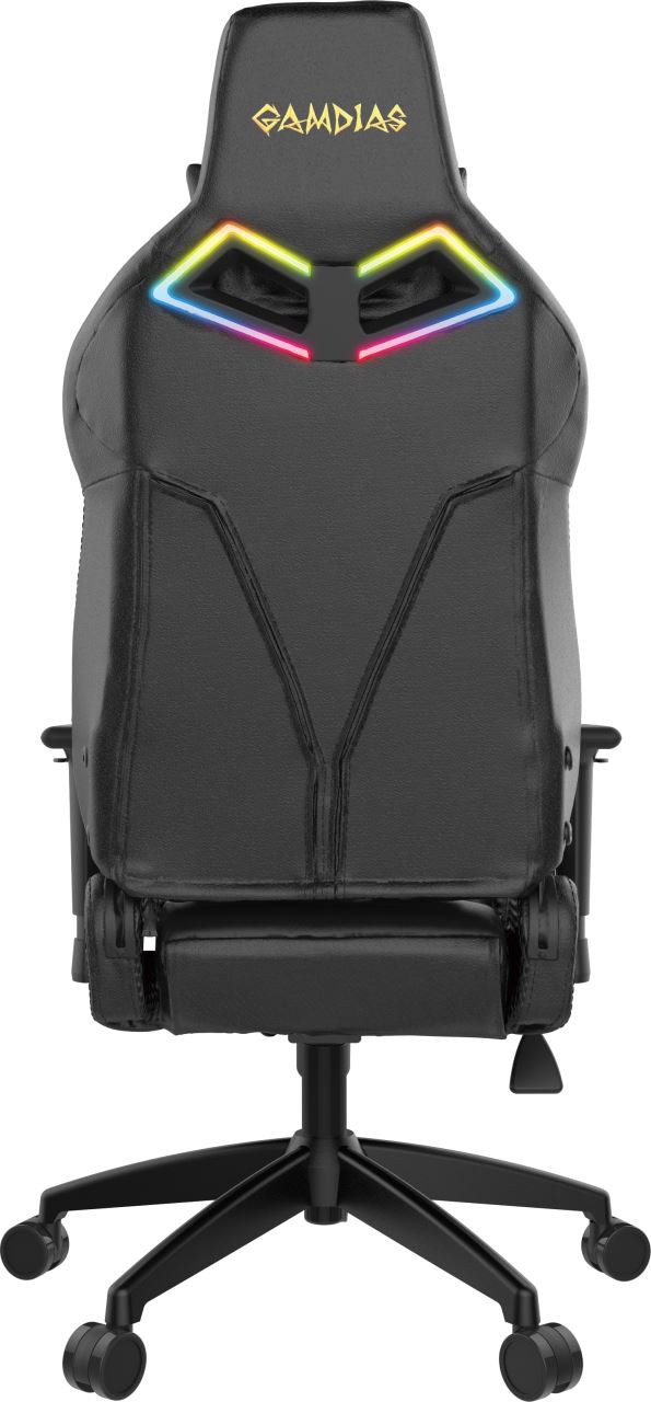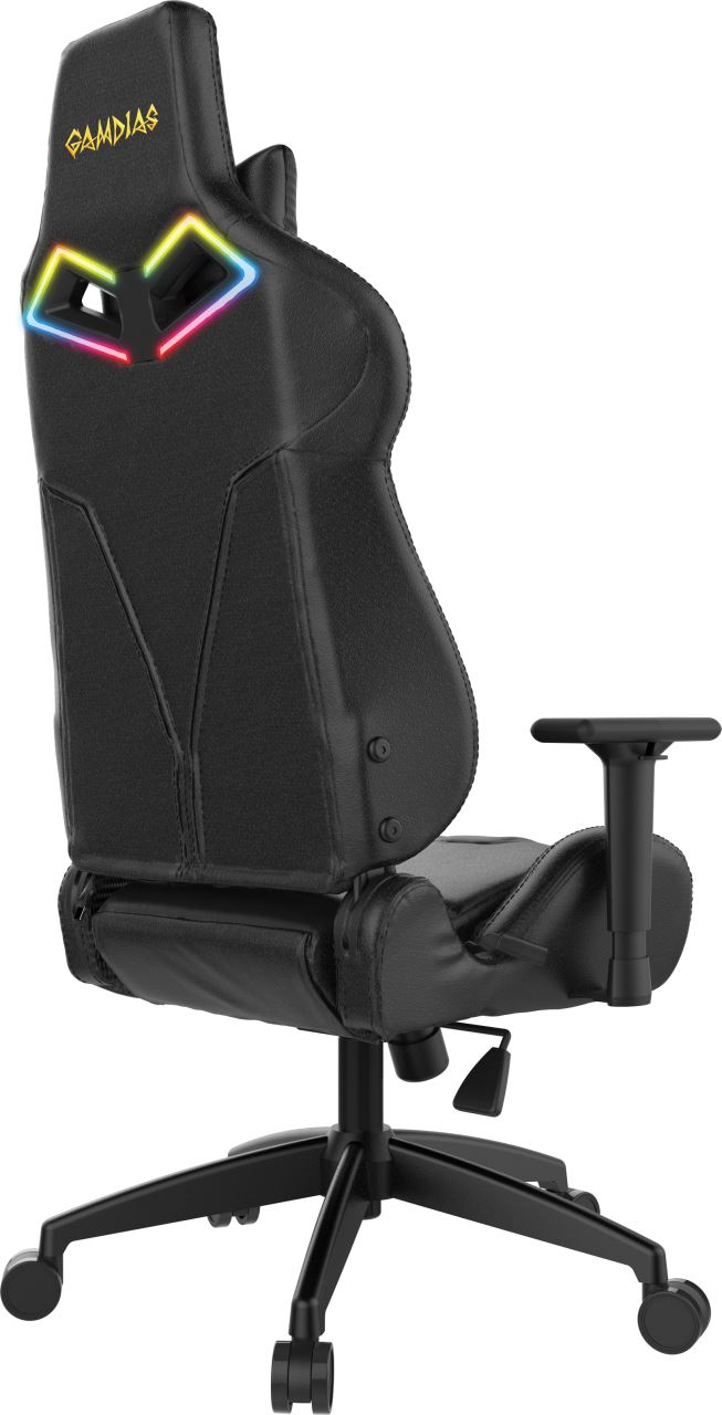 Gamdias Achilles E1 L Black, permite diverse reglaje: inaltime, inclinare, rotire 360°, inaltime scaun: 130-140cm, inaltime sezut: 44-54cm, inaltime spatar: 86cm, latime spatar: 55cm, latime sezut: 54cm, adancime sezut: 47cm, material captuseala: Leather style Vynil, echipat cu piston cu gaz clasa 4, echipat cu LED-uri RGB controlabile prin aplicatia HERA (necesita conectarea cablului USB la calculator; dupa configurare se poate conecta un power bank pentru a mentine LED-urile aprinse), inclinare spatar: 150°, greutate maxima suportata: 200kg, manere 2D