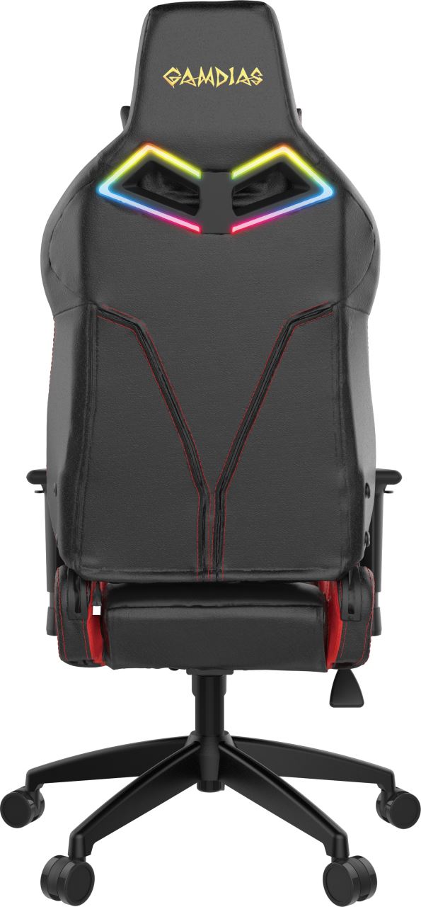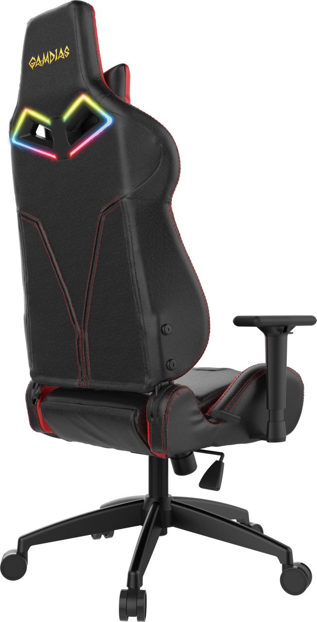 Gamdias Achilles E1 L Black/Red, permite diverse reglaje: inaltime, inclinare, rotire 360°, inaltime scaun: 130-140cm, inaltime sezut: 44-54cm, inaltime spatar: 86cm, latime spatar: 55cm, latime sezut: 54cm, adancime sezut: 47cm, material captuseala: Leather style Vynil, echipat cu piston cu gaz clasa 4, echipat cu LED-uri RGB controlabile prin aplicatia HERA (necesita conectarea cablului USB la calculator; dupa configurare se poate conecta un power bank pentru a mentine LED-urile aprinse), inclinare spatar: 150°, greutate maxima suportata: 200kg, manere 2D