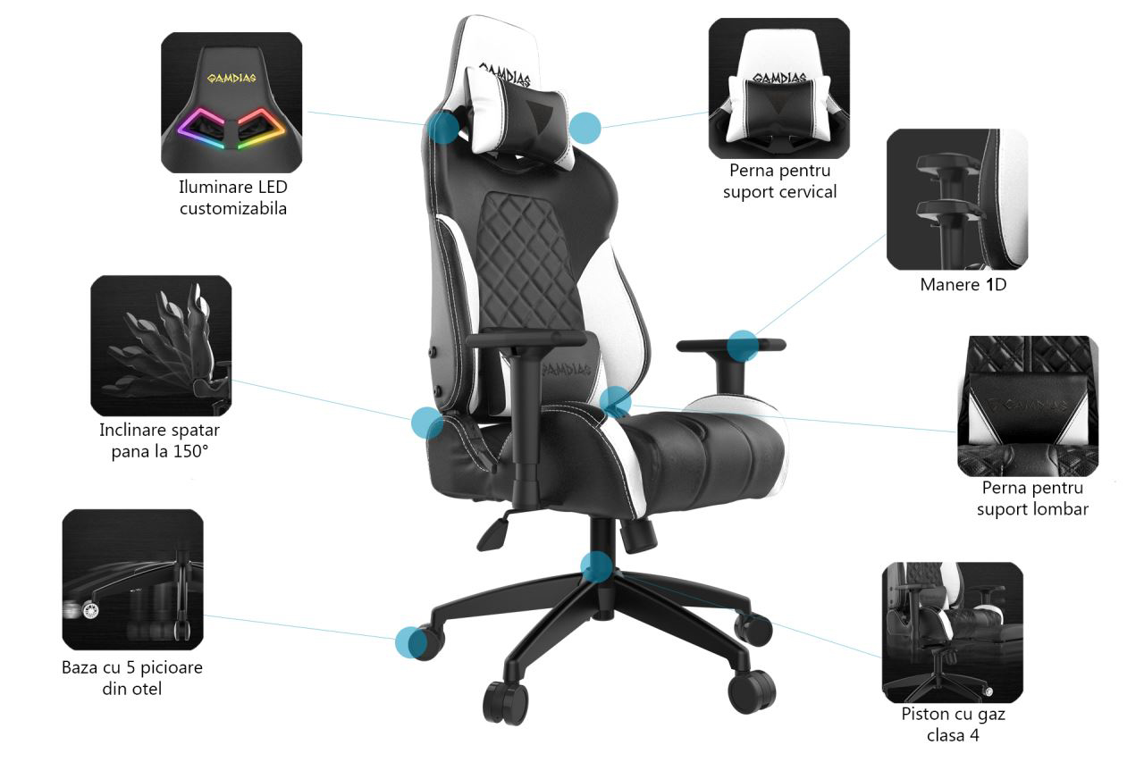 Gamdias Achilles E1 L Black, permite diverse reglaje: inaltime, inclinare, rotire 360°, inaltime scaun: 130-140cm, inaltime sezut: 44-54cm, inaltime spatar: 86cm, latime spatar: 55cm, latime sezut: 54cm, adancime sezut: 47cm, material captuseala: Leather style Vynil, echipat cu piston cu gaz clasa 4, echipat cu LED-uri RGB controlabile prin aplicatia HERA (necesita conectarea cablului USB la calculator; dupa configurare se poate conecta un power bank pentru a mentine LED-urile aprinse), inclinare spatar: 150°, greutate maxima suportata: 200kg, manere 1D