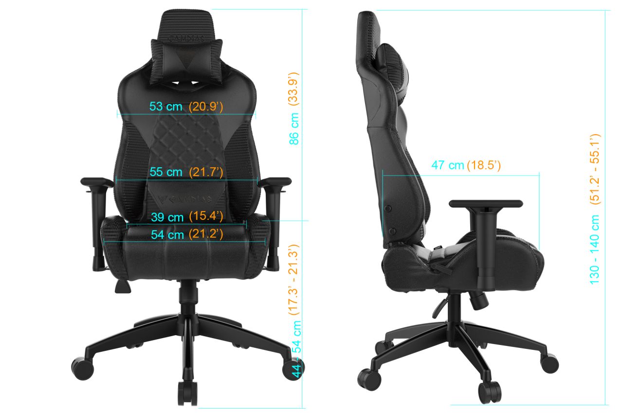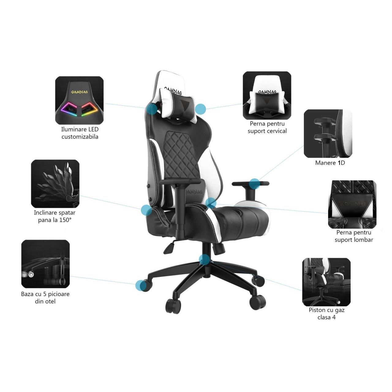 Gamdias Achilles E1 L Black/Yellow, permite diverse reglaje: inaltime, inclinare, rotire 360°, inaltime scaun: 130-140cm, inaltime sezut: 44-54cm, inaltime spatar: 86cm, latime spatar: 55cm, latime sezut: 54cm, adancime sezut: 47cm, material captuseala: Leather style Vynil, echipat cu piston cu gaz clasa 4, echipat cu LED-uri RGB controlabile prin aplicatia HERA (necesita conectarea cablului USB la calculator; dupa configurare se poate conecta un power bank pentru a mentine LED-urile aprinse), inclinare spatar: 150°, greutate maxima suportata: 200kg, manere 1D
