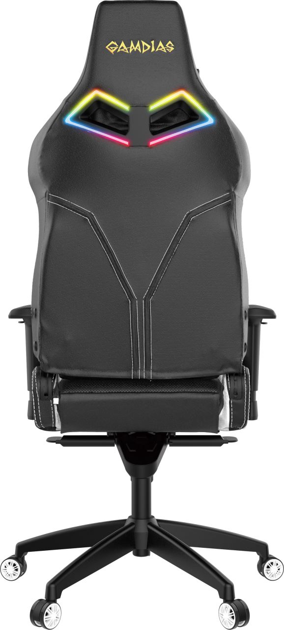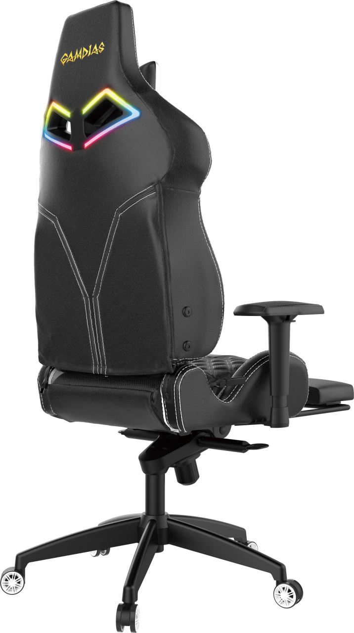 Gamdias Achilles P1 L Black/White, permite diverse reglaje: inaltime, inclinare, rotire 360°, inaltime scaun: 141-151cm, inaltime sezut: 55-65cm, inaltime spatar: 86cm, latime spatar: 53cm, latime sezut: 54cm, adancime sezut: 47cm, material captuseala: Leather style Vynil, echipat cu piston cu gaz clasa 4, echipat cu LED-uri RGB controlabile prin aplicatia HERA (necesita conectarea cablului USB la calculator; dupa configurare se poate conecta un power bank pentru a mentine LED-urile aprinse; in spatele sezutului este un buzunar pentru power bank), inclinare spatar: 150°, greutate maxima suportata: 200kg, manere 4D
