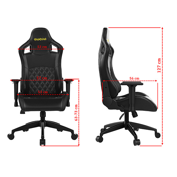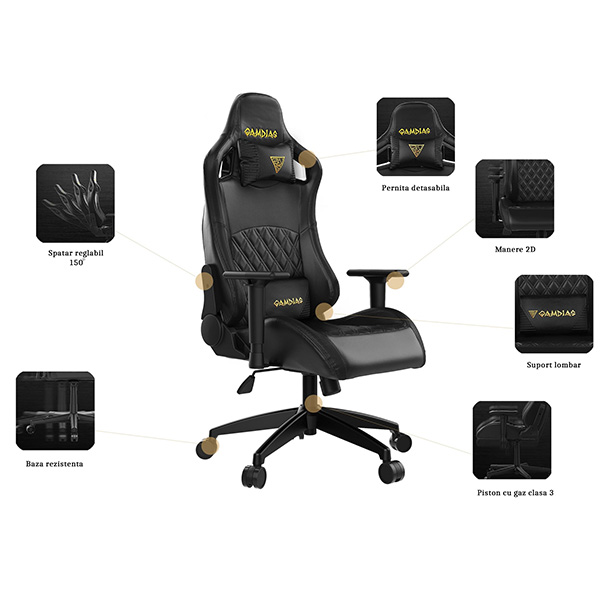 Scaun gaming Gamdias Aphrodite EF1L negru, permite diverse reglaje: inaltime, inclinare, rotire 360°, inaltime scaun: 127-137cm, inaltime sezut: 43-53cm, inaltime spatar: 84cm, latime spatar: 53cm, latime sezut: 53cm, adancime sezut: 56cm, material captuseala: Leather style Vynil, echipat cu piston cu gaz clasa 3, inclinare spatar: 150°, include penite pentru zona lombara si cea cervicala, greutate maxima suportata: 150kg, manere 2D