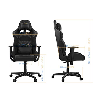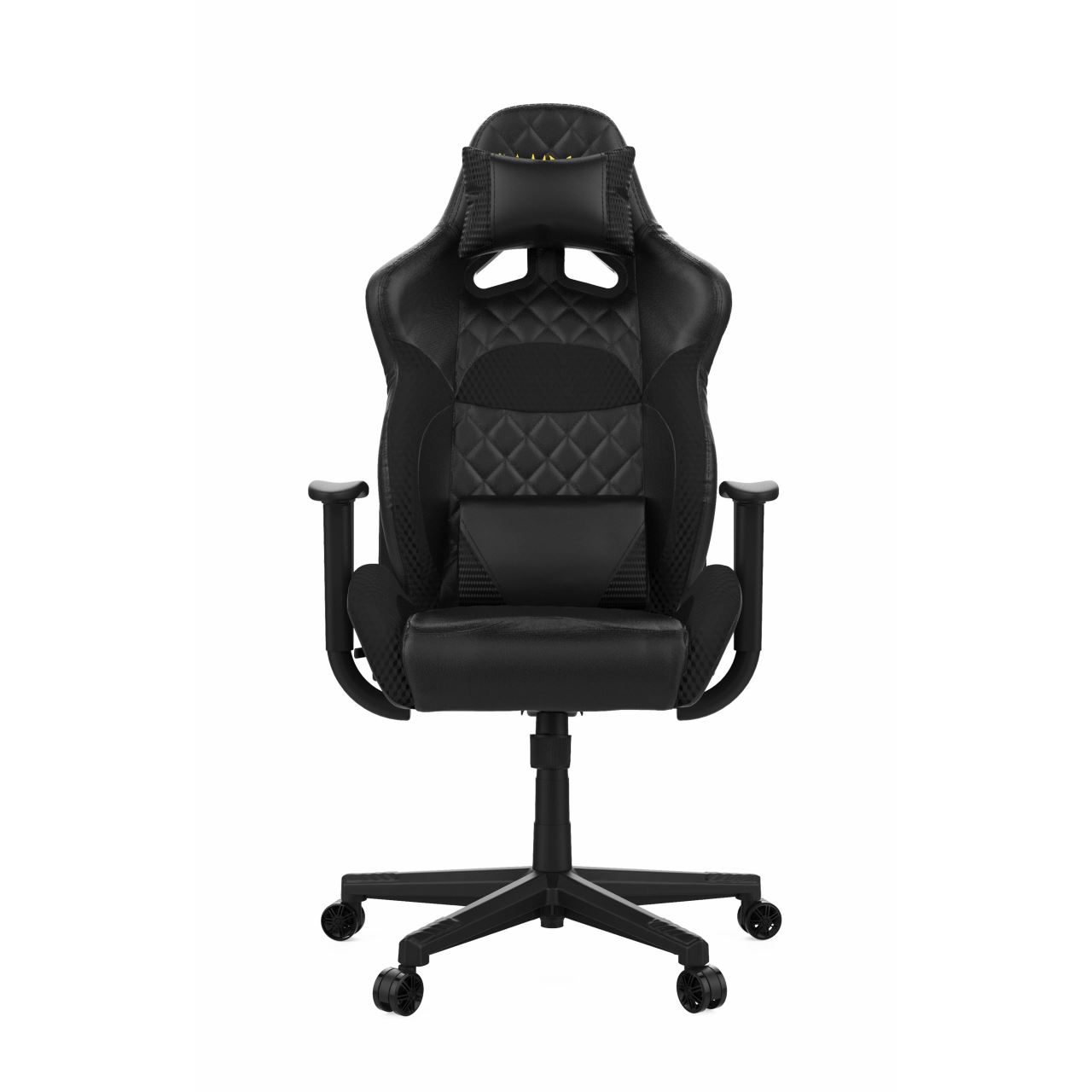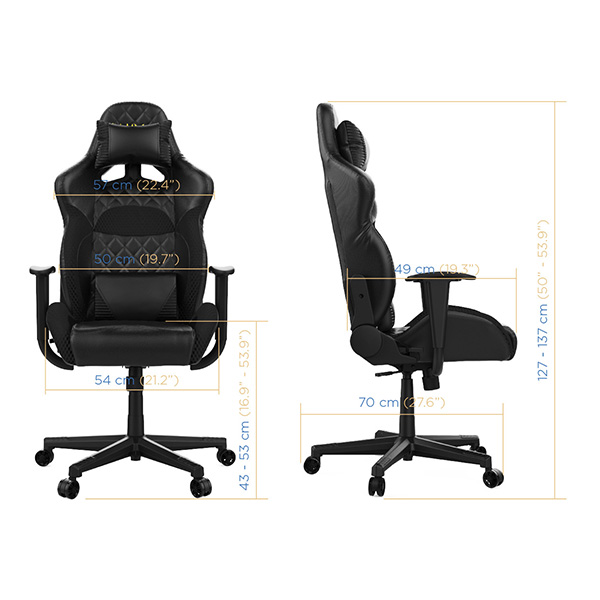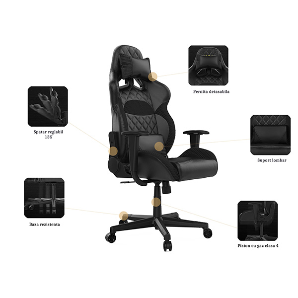 Scaun gaming Gamdias Zelus E1 L negru, permite diverse reglaje: inaltime, inclinare, rotire 360°, inaltime scaun: 127-137cm, inaltime sezut: 43-53cm, inaltime spatar: 84cm, latime spatar: 57cm, latime sezut: 54cm, adancime sezut: 49cm, material captuseala: Leather style Vynil, echipat cu piston cu gaz clasa 4, inclinare spatar: 135°, greutate maxima suportata: 200kg, manere 1D