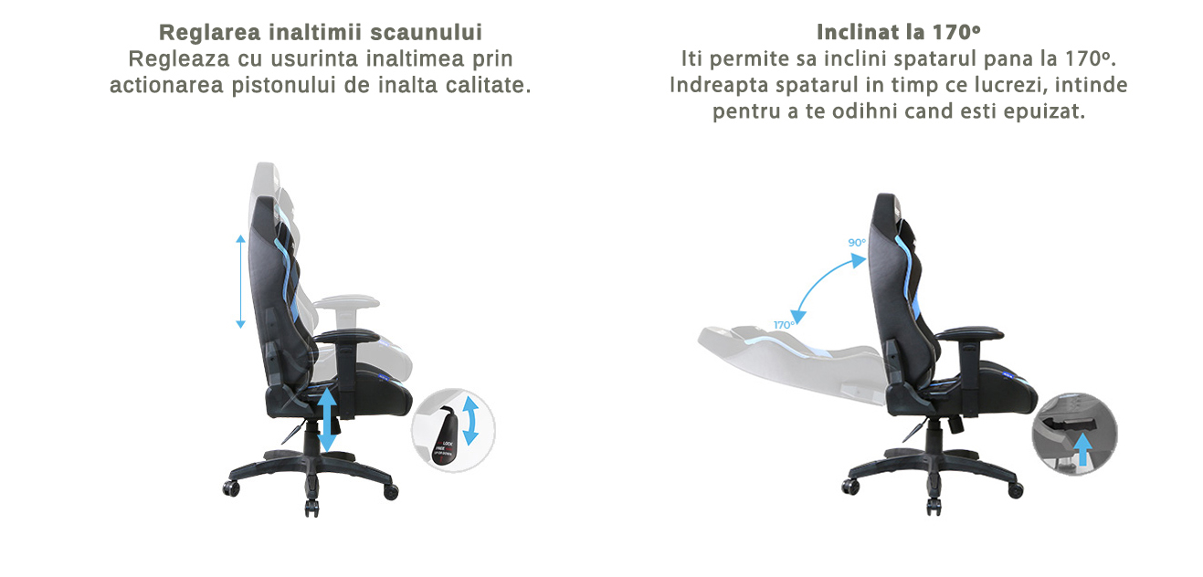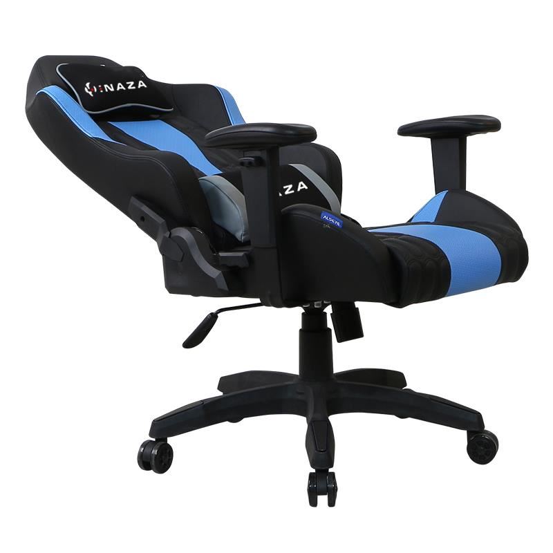 Scaun gaming Inaza Alvis negru cu albastru, permite diverse reglaje: inaltime, inclinare spatar pana la 170°, rotire 360°, functie de recliner pana la 15°, sezut si spatar prevazut cu benzi elastice verzi, manere 1D, material captuseala: PU perforat, echipat cu piston cu gaz clasa 4, inaltime manere: 28-34.5cm, latime sezut: 54cm, adancime sezut: 52cm, inaltime sezut reglabila: 47-56cm, inaltime spatar: 84cm, latime spatar: 54cm, inaltime scaun: 123-132cm, include perna cervicala din spuma cu memorie si perna lombara, greutate maxima admisa: 130kg