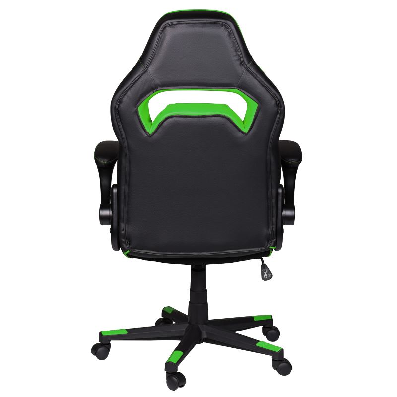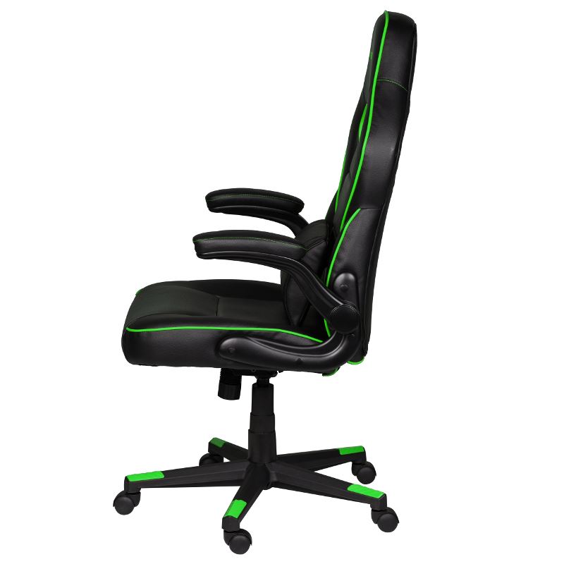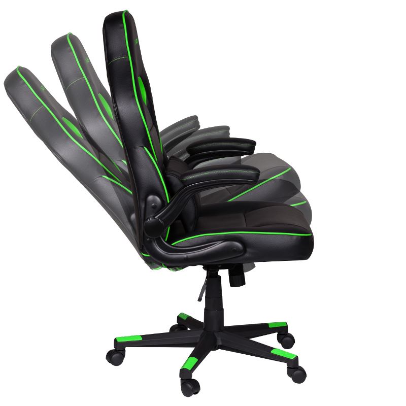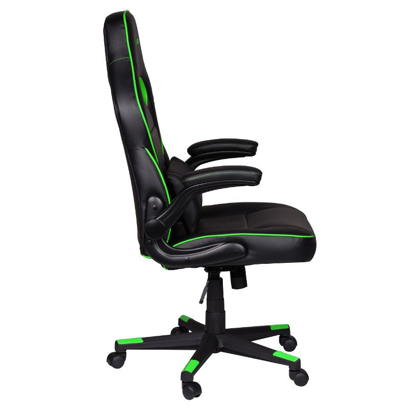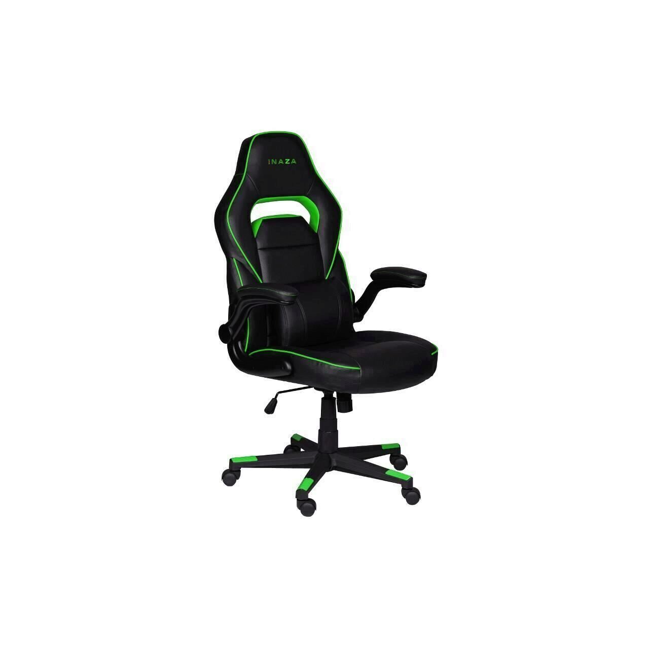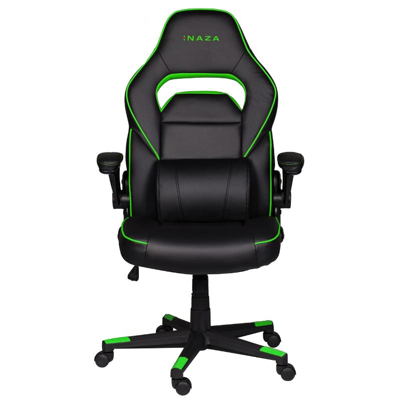 Inaza Interceptor Black/Green, permite diverse reglaje: inaltime, inclinare 135°, rotire 360°, manere care se pot rabata, material captuseala: PU, echipat cu piston cu gaz clasa 4, latime scaun: 54cm, adancime scaun: 50cm, inaltime sezut reglabila: 44-52cm, inaltime spatar: 77cm, latime spatar: 56cm, inaltime scaun: 116-124cm