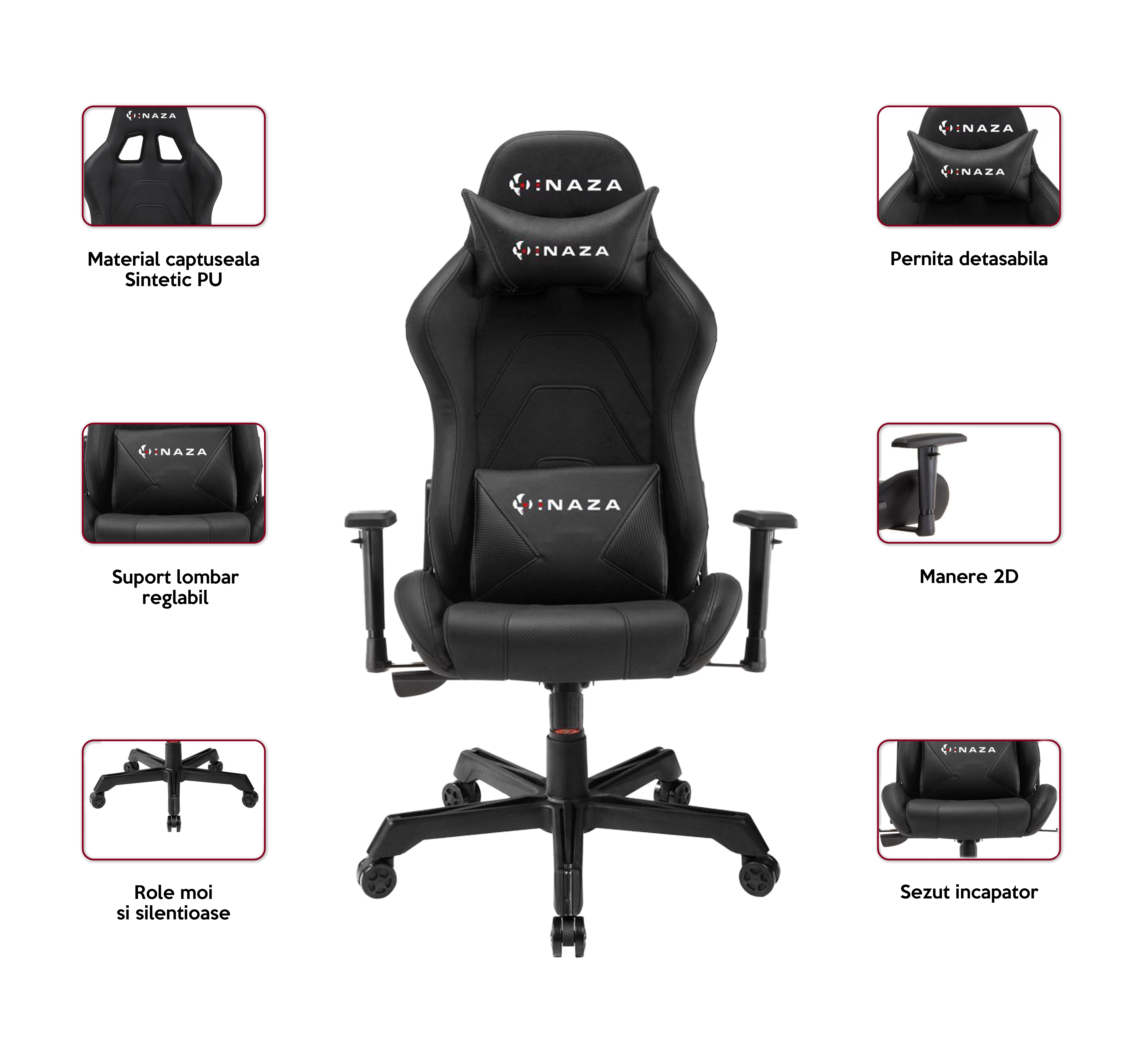 Pentru a asigura o pozitie confortabila scaunul vine echipat cu perna pentru suport lombar si cervical.