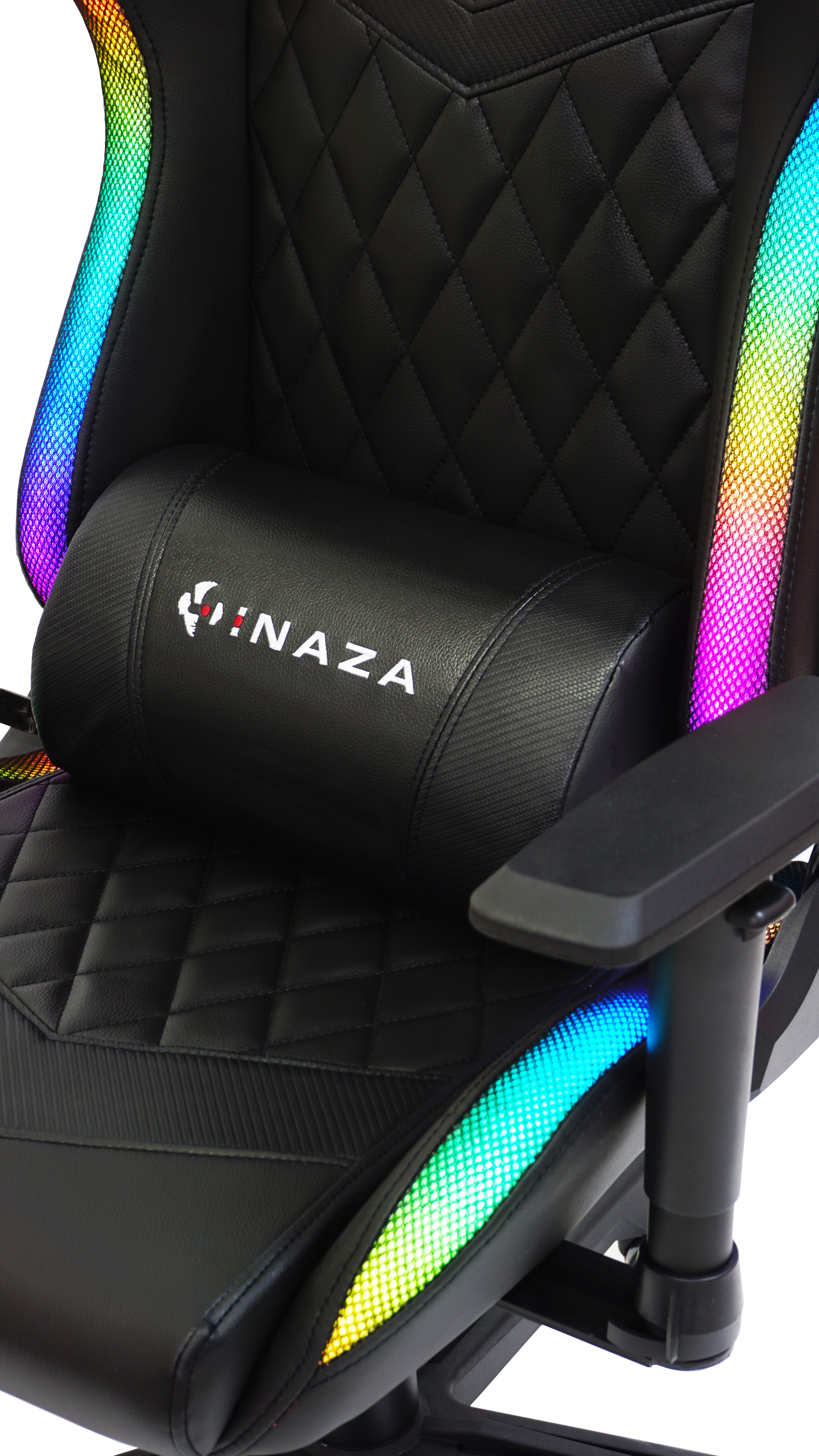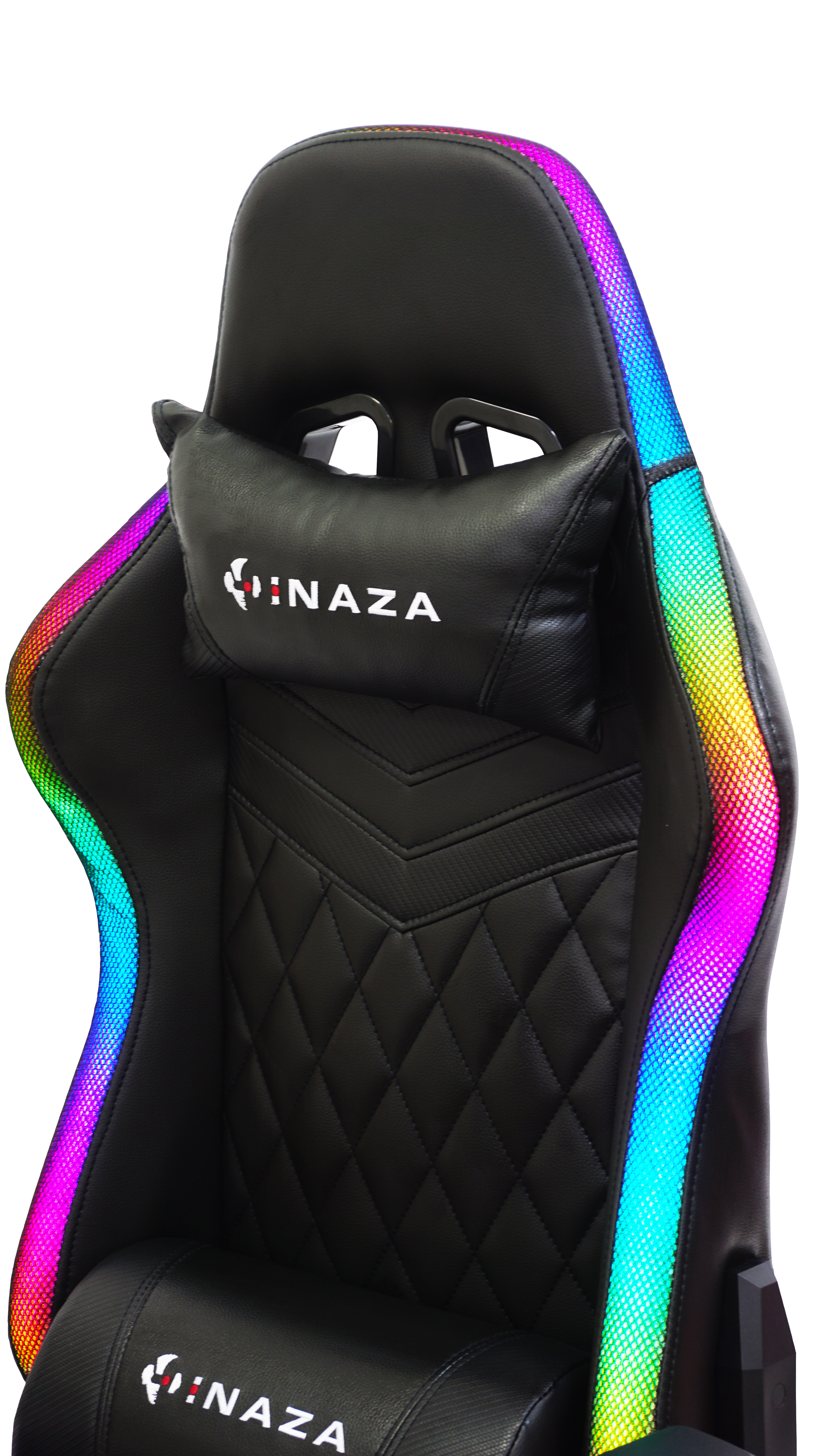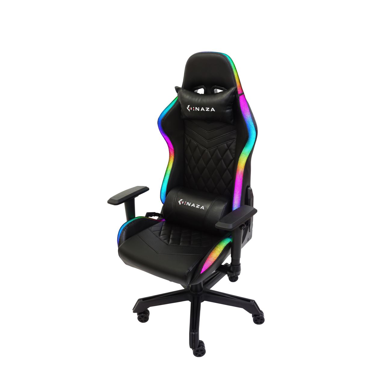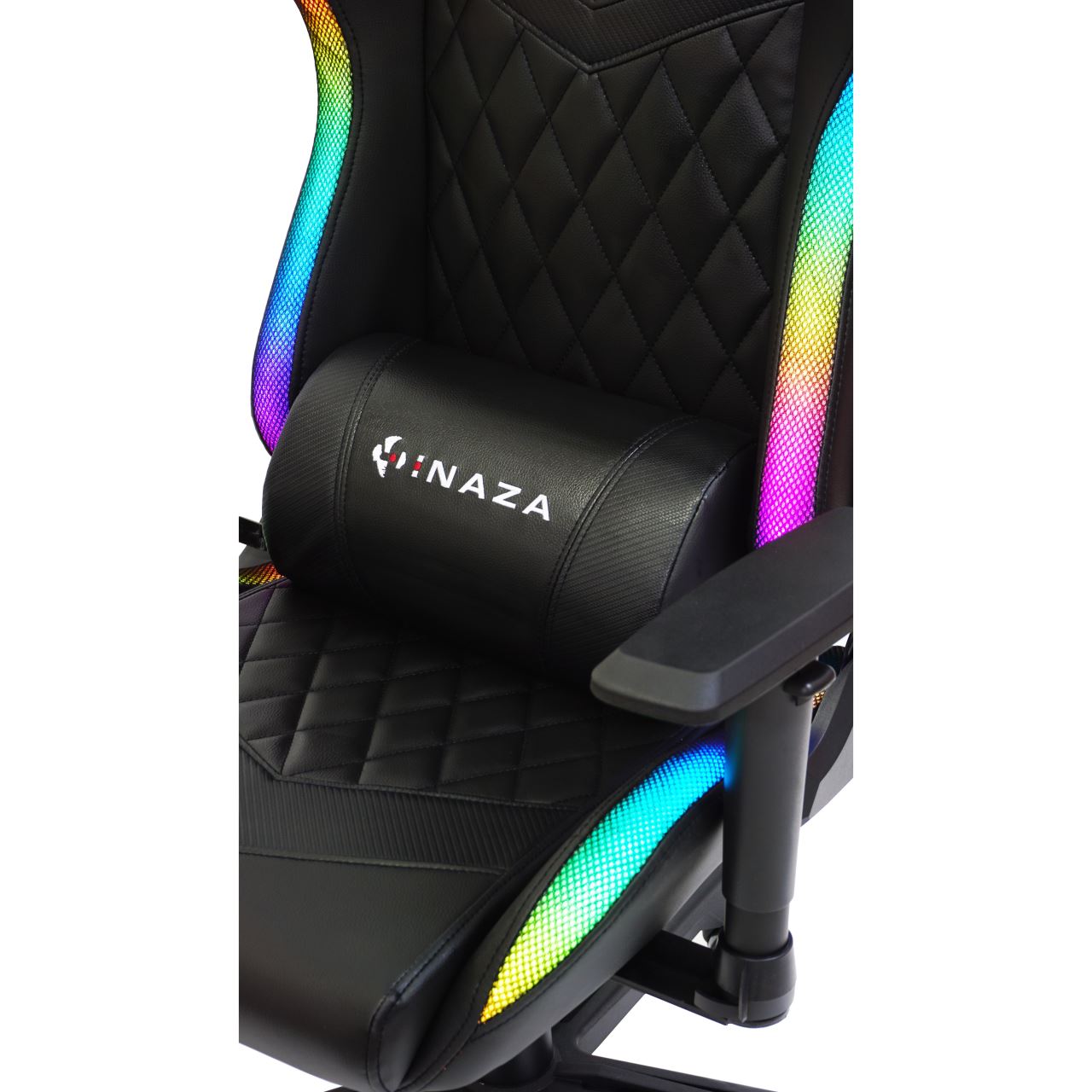 Scaun gaming Inaza Rainbow negru iluminare RGB, marginile scaunului sunt iluminate RGB (peste 40 de moduri de iluminare), alimentarea se poate face de la PC/laptop sau utilizand un power bank care se poate stoca in buzunarul de pe spatele scaunului, include telecomanda pentru configurarea iluminarii, permite diverse reglaje: inaltime, inclinare 180°, rotire 360°, manere 2D, material captuseala: PU, echipat cu piston cu gaz clasa 3, latime sezut: 54cm, adancime sezut: 50cm, inaltime sezut reglabila: 43-50cm, inaltime spatar: 82cm, latime spatar: 52cm, inaltime scaun: 123-130cm, greutate maxima suportata: 130kg