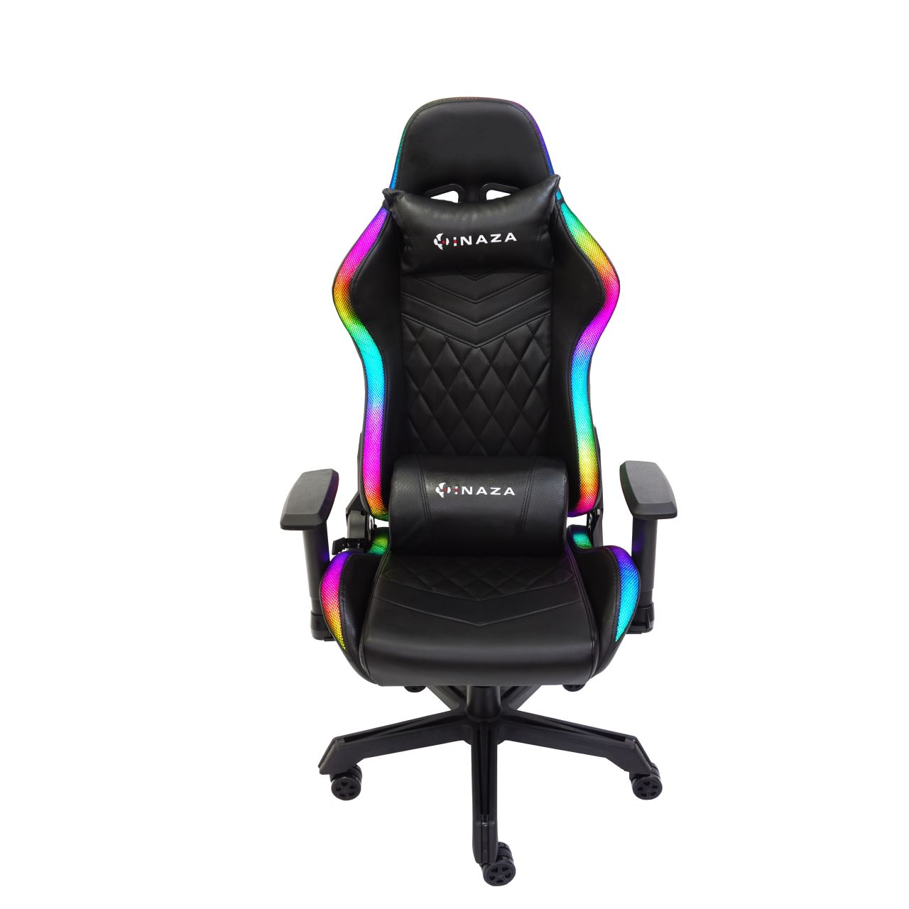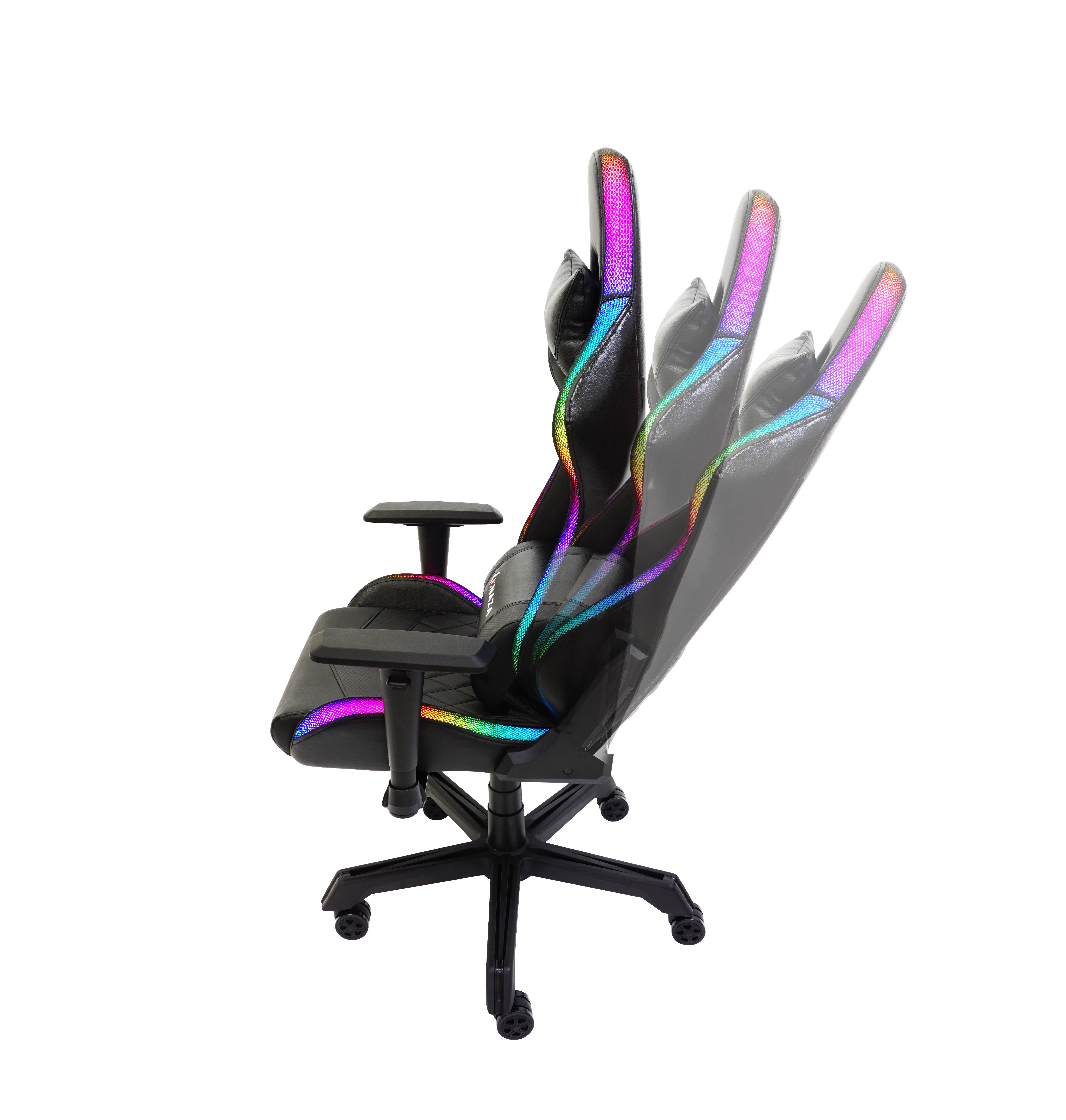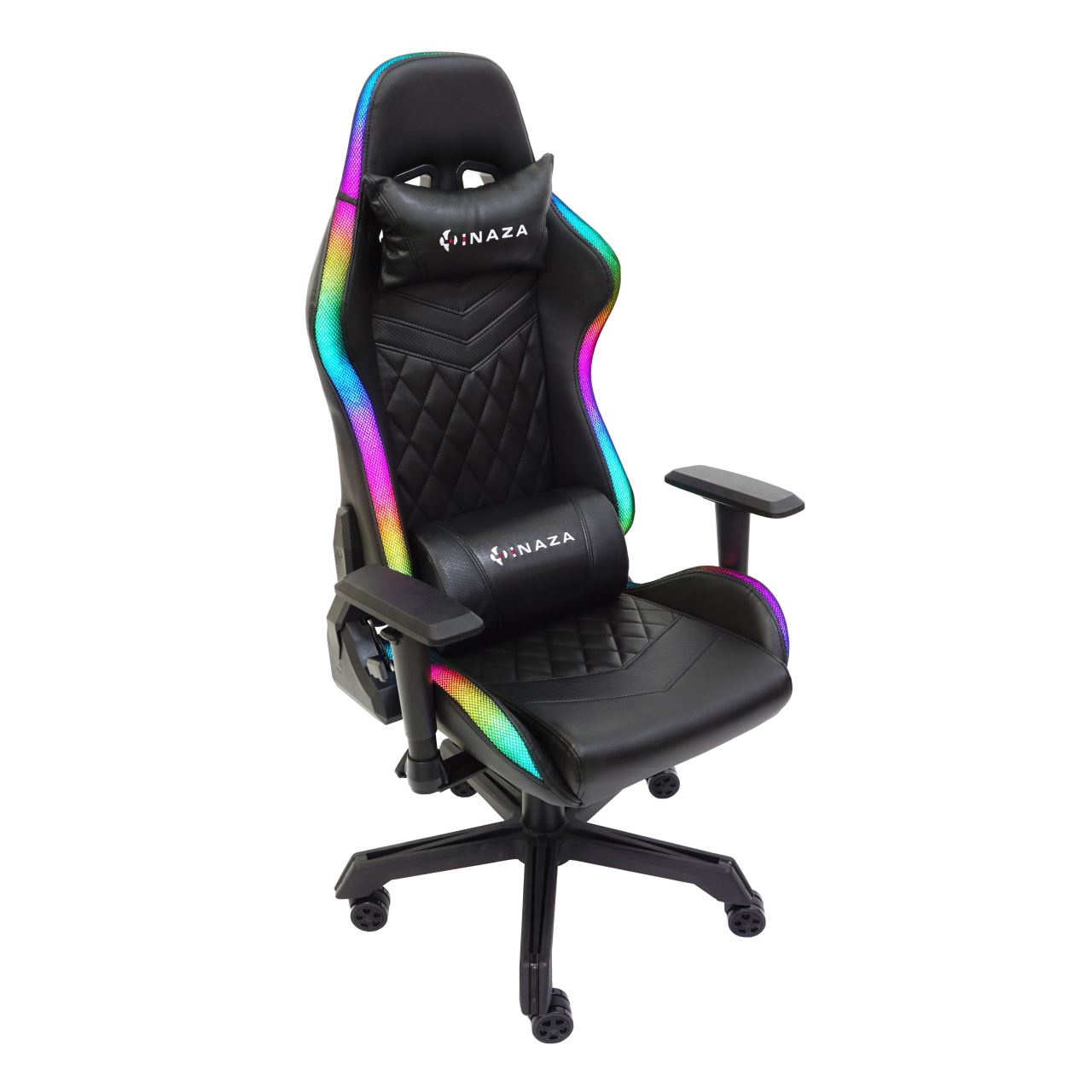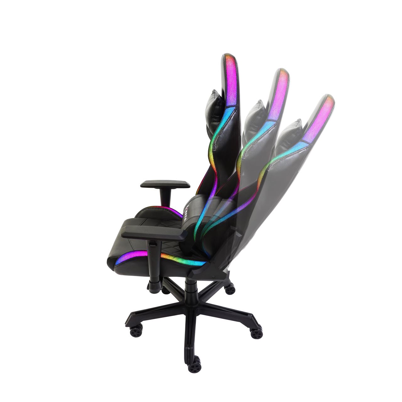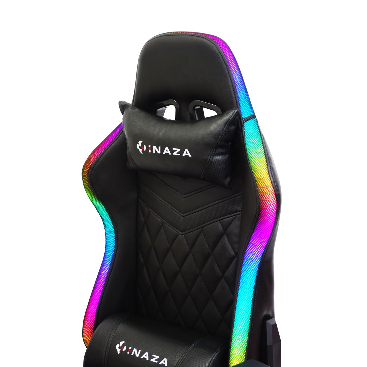 Scaun gaming Inaza Rainbow negru iluminare RGB, marginile scaunului sunt iluminate RGB (peste 40 de moduri de iluminare), alimentarea se poate face de la PC/laptop sau utilizand un power bank care se poate stoca in buzunarul de pe spatele scaunului, include telecomanda pentru configurarea iluminarii, permite diverse reglaje: inaltime, inclinare 180°, rotire 360°, manere 2D, material captuseala: PU, echipat cu piston cu gaz clasa 3, latime sezut: 54cm, adancime sezut: 50cm, inaltime sezut reglabila: 43-50cm, inaltime spatar: 82cm, latime spatar: 52cm, inaltime scaun: 123-130cm, greutate maxima suportata: 130kg