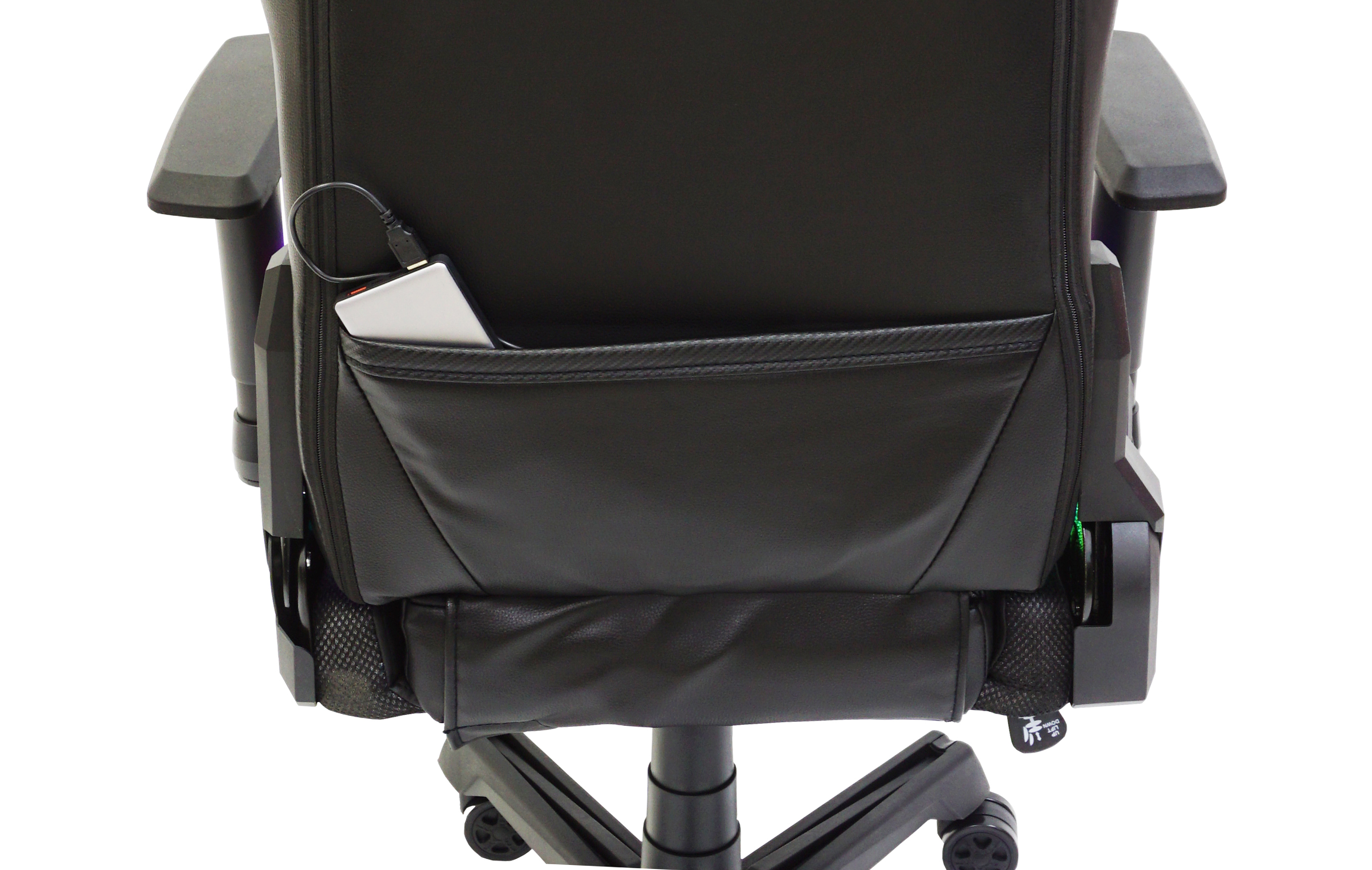 Sistemul de iluminat RGB poate fi alimentat de un incarcator de retea sau un powerbank,care poate fi plasat intr-un buzunar special conceput pe spatele scaunului, acestea nu sunt incluse.