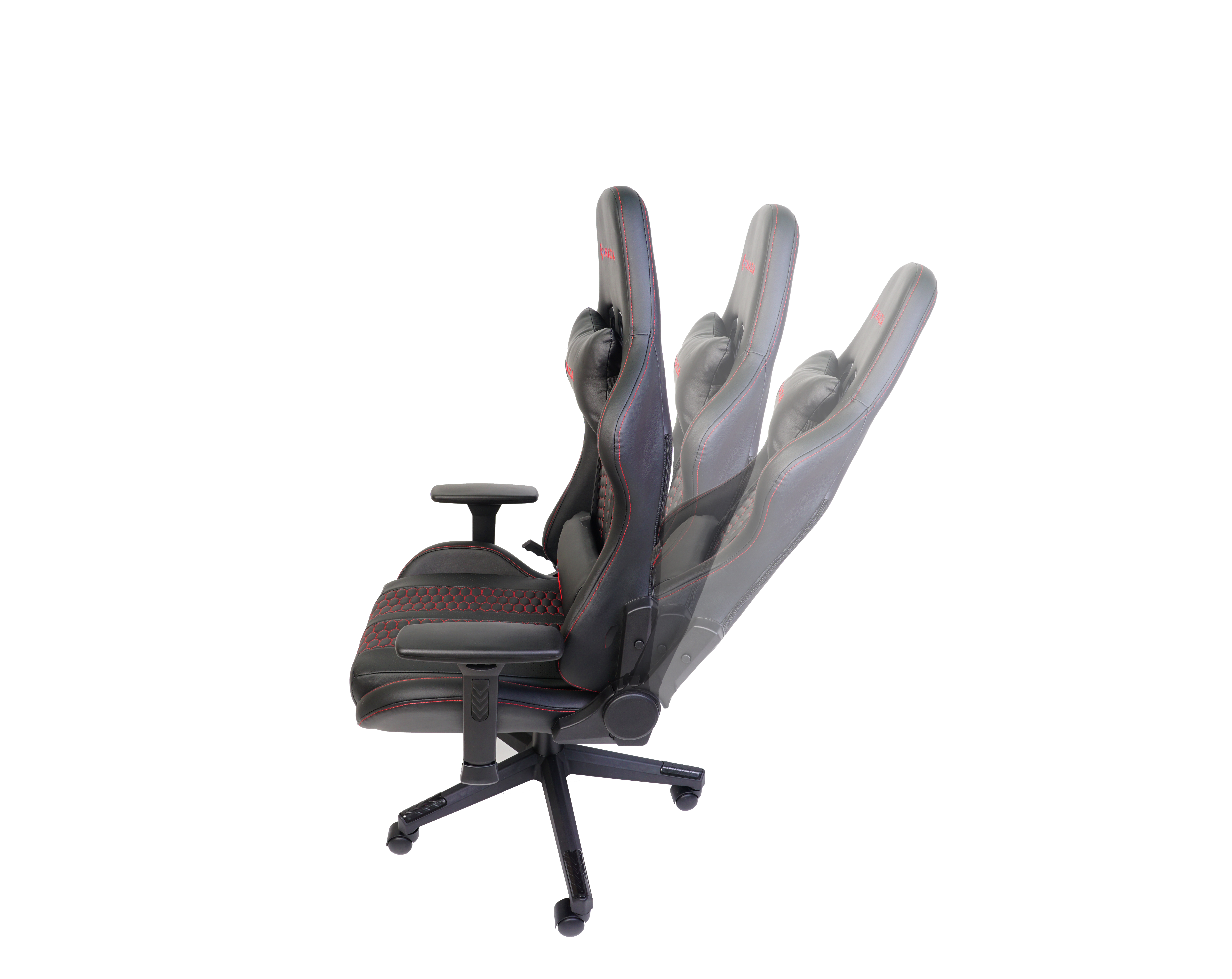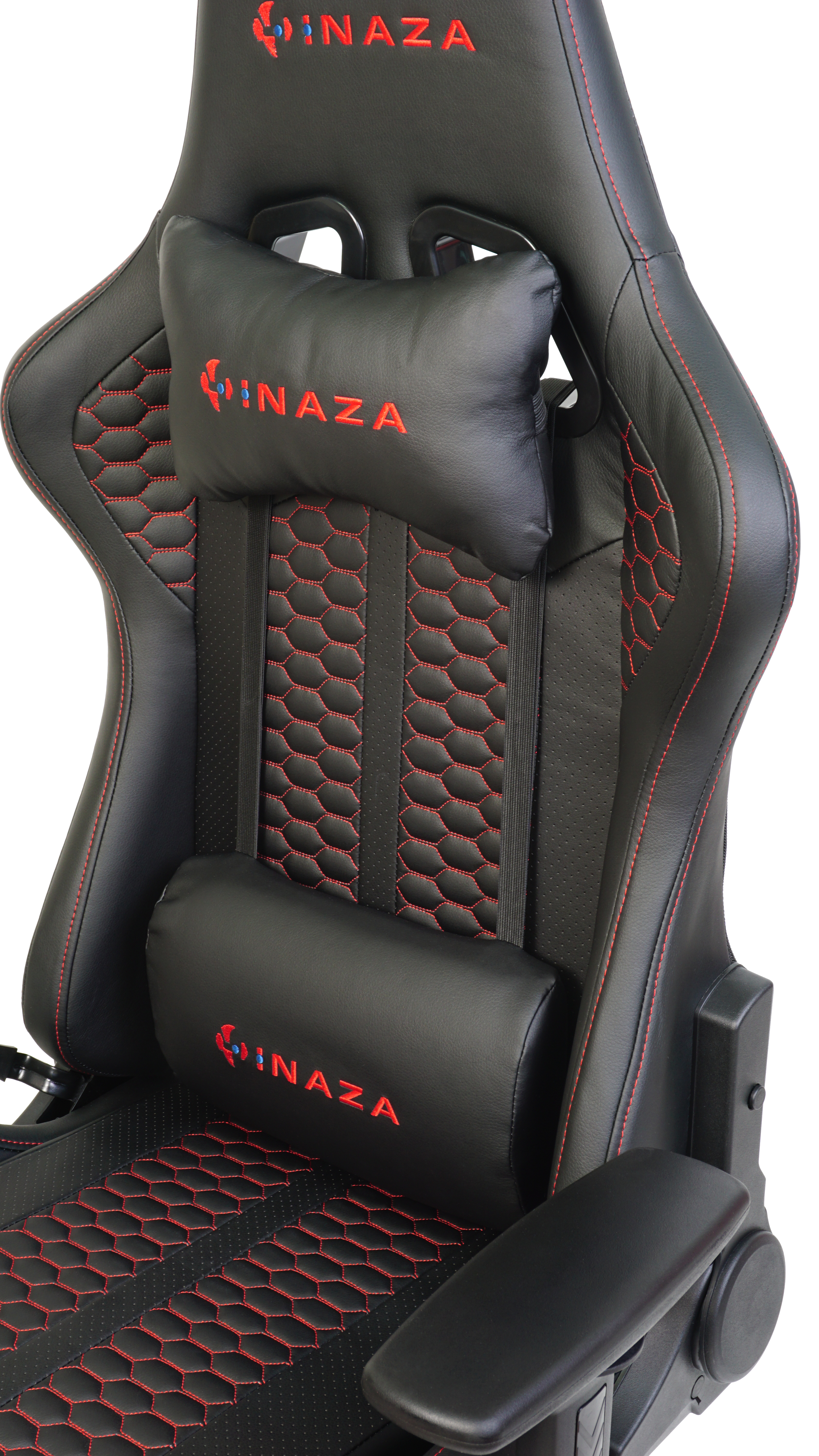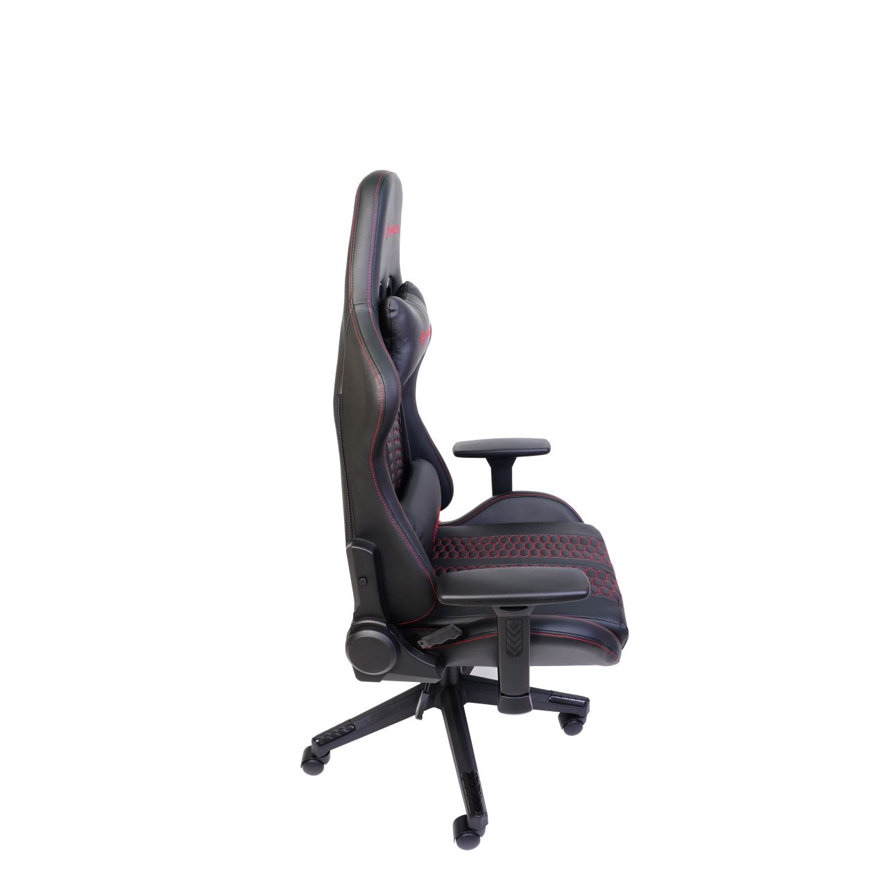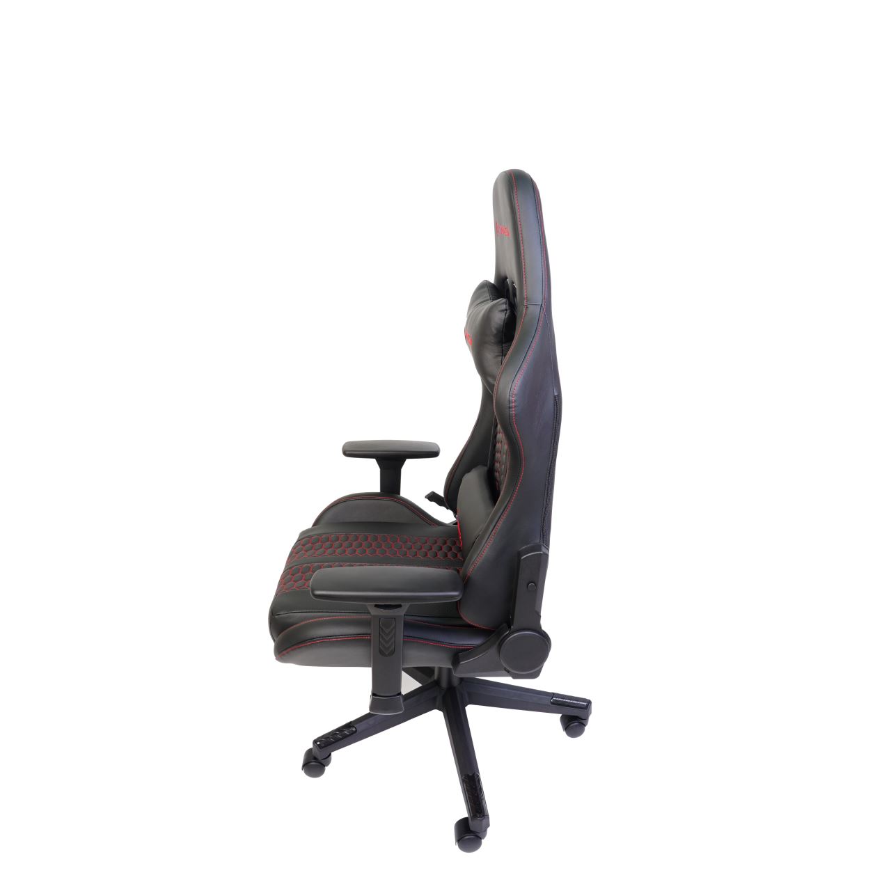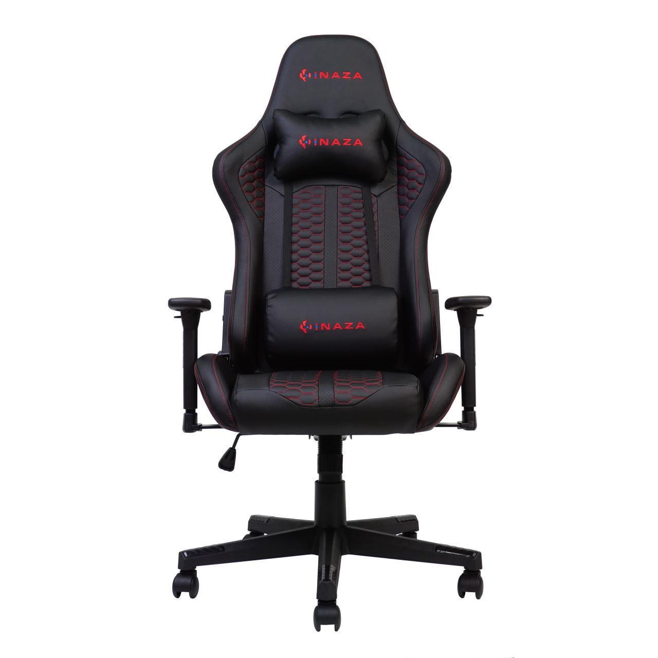 Scaun gaming Inaza Raven negru, permite diverse reglaje: inaltime, inclinare, rotire 360°, manere 1D, material captuseala: Sintetic PU perforata, model hexagonal din cusaturi rosii, echipat cu piston cu gaz clasa 3, latime sezut: 56cm, adancime sezut: 50cm, inaltime sezut reglabila: 48-58cm, inaltime spatar: 84cm, latime spatar: 58cm, inaltime scaun: 123-133cm, greutate maxima admisa: 130kg.
