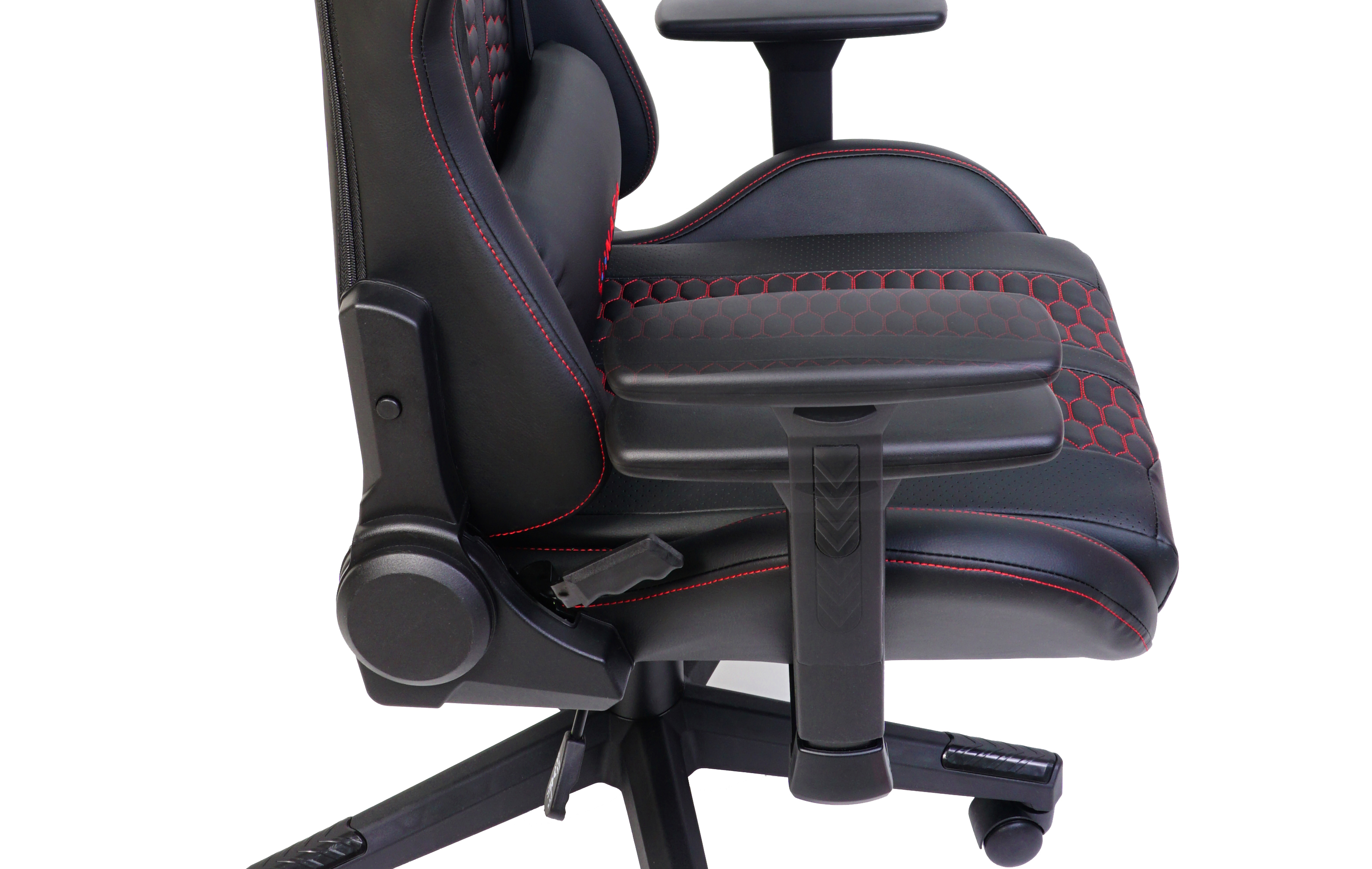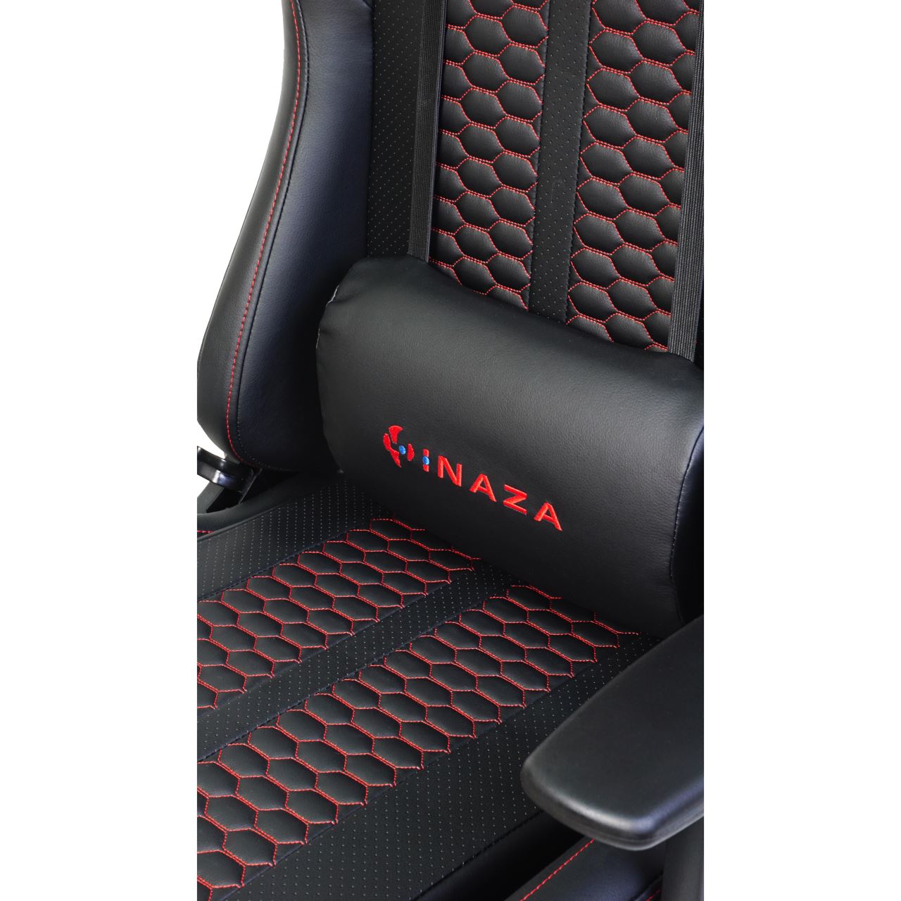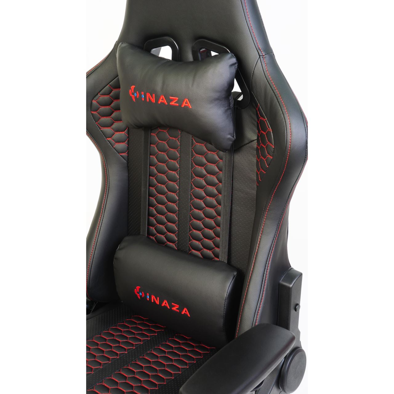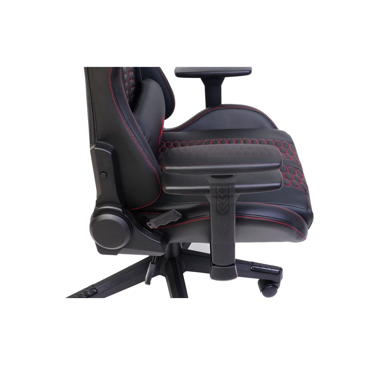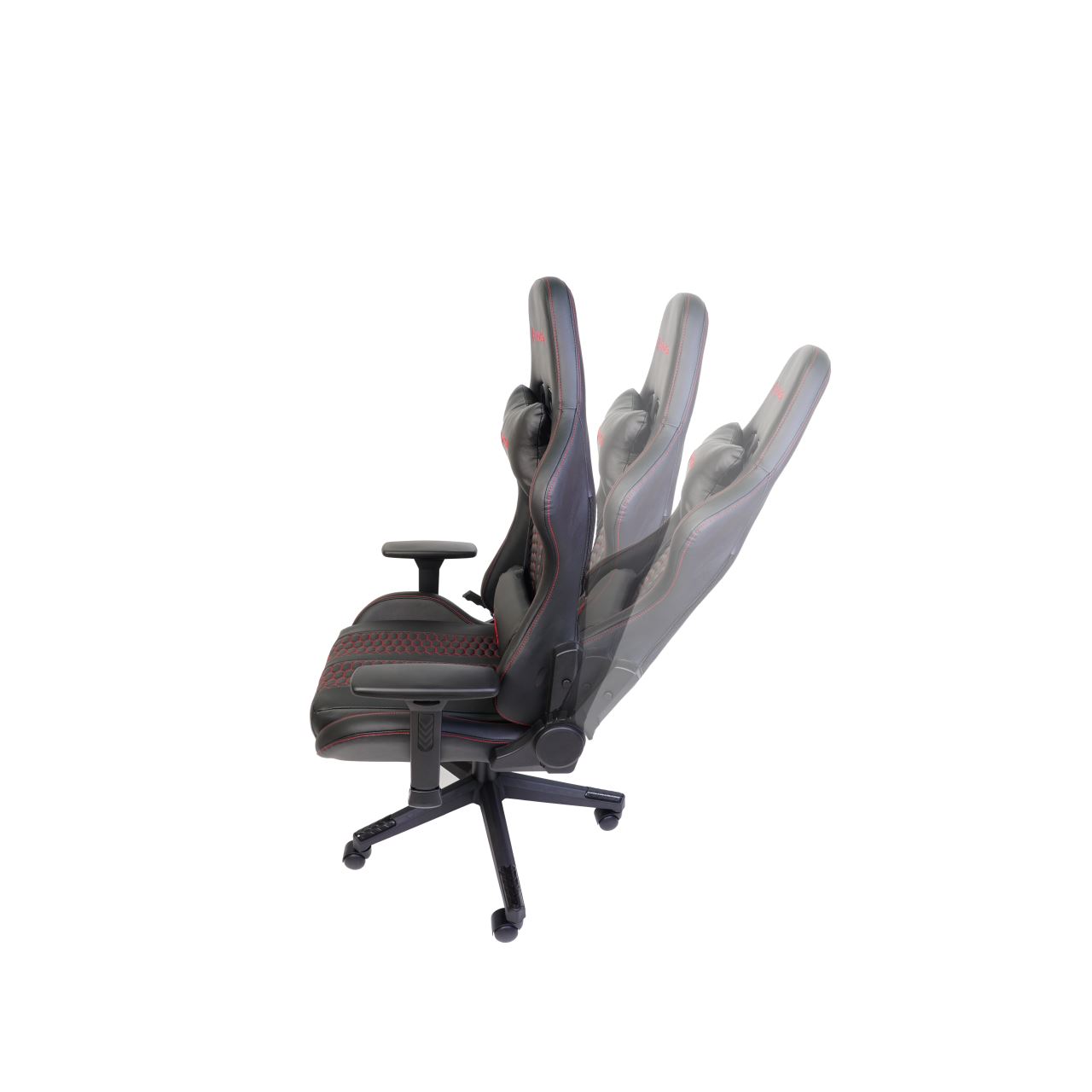 Scaun gaming Inaza Raven negru, permite diverse reglaje: inaltime, inclinare, rotire 360°, manere 1D, material captuseala: Sintetic PU perforata, model hexagonal din cusaturi rosii, echipat cu piston cu gaz clasa 3, latime sezut: 56cm, adancime sezut: 50cm, inaltime sezut reglabila: 48-58cm, inaltime spatar: 84cm, latime spatar: 58cm, inaltime scaun: 123-133cm, greutate maxima admisa: 130kg.